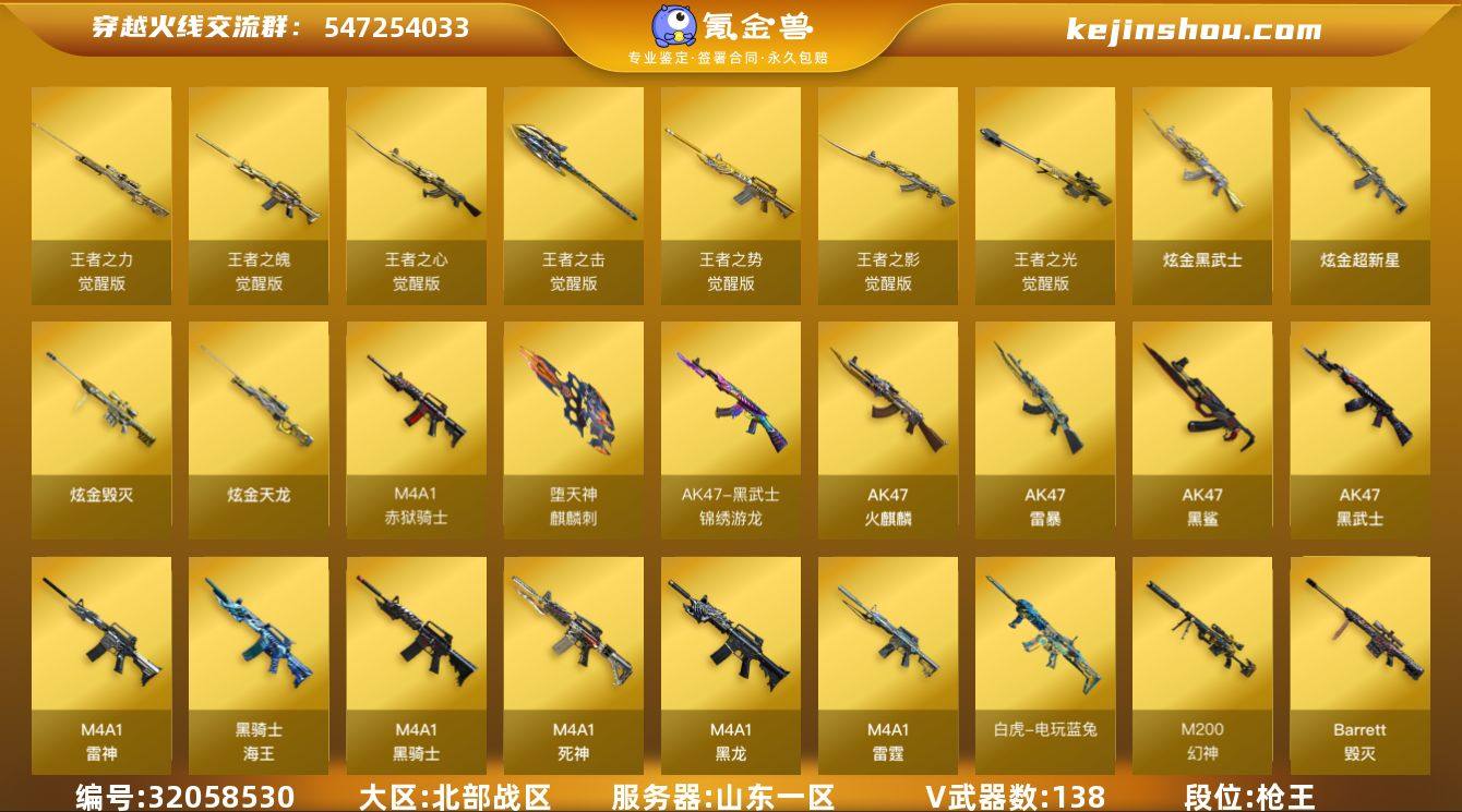 【ky4946】山东一区-142V-8王者-4炫金 【热门武器】:QBZ03-金色蔷薇,M14EBR-玄武,M200-幻神,死亡之眼,白虎-电玩蓝兔,M4A1-黑骑士,汤姆逊-烈龙*8,RPK-盘龙*2,加特林-炼狱,火麒麟-绝迹,USP-雷暴,沙鹰-修罗 【王者炫金武器】:炫金武士,炫金超新星,炫金毁灭,炫金天龙 【音效卡】:天神-动感闪耀 音效卡,AK47-火麒麟音效卡,M4A1-雷神音效卡,M4A1-黑骑士音效卡,Barrett-毁灭音效卡 【皮肤】:幻神-动感闪耀 皮肤,幻神-星火小队签名臻藏版 皮肤,裁决-流光秘银,雷神-能量核心,雷神-荣耀之魄,雷神-星空,雷神-传奇N9,雷神-宇航兔皮肤,火麒麟-AG战队皮肤,火麒麟-华夏之心,AK47-火麒麟-传奇EVEN,火麒麟-轻羽皮肤,火麒麟-平天大圣*2,火麒麟-百城,火麒麟-心动糖果,毁灭耀金皮肤*2,M4A1-千变-孔明皮肤,M4A1-黑龙-361,黑骑士-冠军之势,战神-粉色甜心皮肤,战神-紫绶金章皮肤,战神-流金岁月皮肤,AK47-B-常胜将军-曹操*3,AK47-B-常胜将军-刘备,AK47-B-常胜将军-孙权*2,AWM-天龙-传奇白鲨*2,极光-能量核心,修罗-能量核心*2,擎天-冠军之击 【角色】:葵,樱,魅影,炫,王者-零-国色天香,王者-零,乔伊教练,暗夜-X,初恋灵狐,芳心审判者,风暴女,嘉年华灵狐,娟娟,兰-海滩派对,灵狐者-X,灵狐者-七夕宝贝,灵狐者-职业经理,龙儿,龙儿-小淘气,潘多拉-X,潘多拉-甜心教官,潜龙队-X,斯沃特-X,铁骑荣耀,兔囡囡,影武者-X 【人偶武器】:火麒麟-绝迹,天龙-曼陀罗,AWM-灵狐-15周年嘉年华,迷你牛牛,迷你生化手雷,闪光弹-小乔*2,闪光弹-貂蝉,高爆手雷-大乔,迷你超能女侍 【暴走生化】:死亡之眼 【挑战大师】:神圣爆裂者III,激光毁灭者III*3 【英雄级武器】:AK47-火麒麟*3,M4A1-黑龙,M4A1-雷神*4,M4A1-黑骑士,M4A1-死神*4,AK47-黑武士,AK12-天启*3,AN94-超新星...
