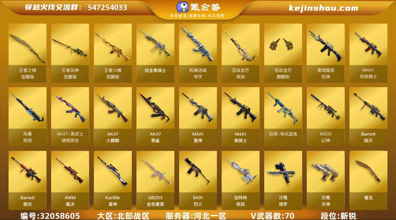 【ky6166】河北一区-77V-11王者武器数-1炫金武器数 【传说角色】:传说星骇 【热门武器】:QBZ03-金色蔷薇,M200-幻神,M200-竞技荣光,白虎-电玩蓝兔,Kar98K-星神,M4A1-黑骑士,加特林-炼狱,斯泰尔-蝴蝶,USP-雷暴,沙鹰-修罗*2 【王者炫金武器】:炫金骑士,王者之魄高爆手雷*3,王者之魄闪光弹*2 【音效卡】:AWM-裁决音效卡,沙鹰-修罗-盛典舞曲音效卡*2,炼狱-百战金芒-庆典舞曲音效卡,死神-雪域霜狐-怀旧音效卡 【皮肤】:幻神-宠儿-2021MVP,M200-幻神-N9-2022MVP,裁决-巅峰荣耀 皮肤,星神-璀璨皮肤,雷神-宠儿-2019MVP,雷神-R.LGD-CFPLS18冠军,M4A1-再燃火线,火麒麟-平天大圣,火麒麟-心动糖果,毁灭-风暴*2,毁灭-英雄计划 皮肤,轻型军用手斧-再燃火线 【角色】:魅影,零·纪元,王者-迷迭香,雪域霜狐,乔伊教练,修道士,云海玲珑,葵-阿尔法武装,暗夜-X,初恋灵狐,电竞少女,飞虎队-X,嘉年华灵狐,兰-新年限定,灵狐-花神,灵狐者-X,灵狐者-职业经理,龙儿-小淘气,麻雀,娜塔莉娅,潘多拉-X,潘多拉-甜心教官,青霞仙子,斯沃特-X,蜀雪,兔囡囡,樱-战斗天使,游珑儿 【人偶武器】:斯泰尔-蝴蝶,AWM-灵狐-15周年嘉年华,迷你深渊冰龙,迷你裂空之翼*3,迷你牛魔王,迷你波特博士*3,迷你曼提柯尔,迷你火种,深渊终结者手雷 【挑战大师】:神圣爆裂者III*2,AK47-冰龙粉碎者,冰龙粉碎者-白马银枪,激光毁灭者III-白马银枪,激光毁灭者III,试炼破坏者III,KAC-圣炎切割者III,神圣爆裂者-末日III 【英雄级武器】:AK47-火麒麟,M4A1-雷神,M4A1-黑骑士,AK47-黑鲨,黑武士-锦绣游龙,死神-雪域霜狐,QBZ03-独角-III,QBZ03-金色蔷薇,9A91-烈火,王者火魄-觉醒版,白虎-电玩蓝兔,HK417-朱雀-电竞之星,机械迷城-穹宇,Barrett-毁灭,Barrett-极光,AWM-裁决,M200-幻神,Kar98K-星...