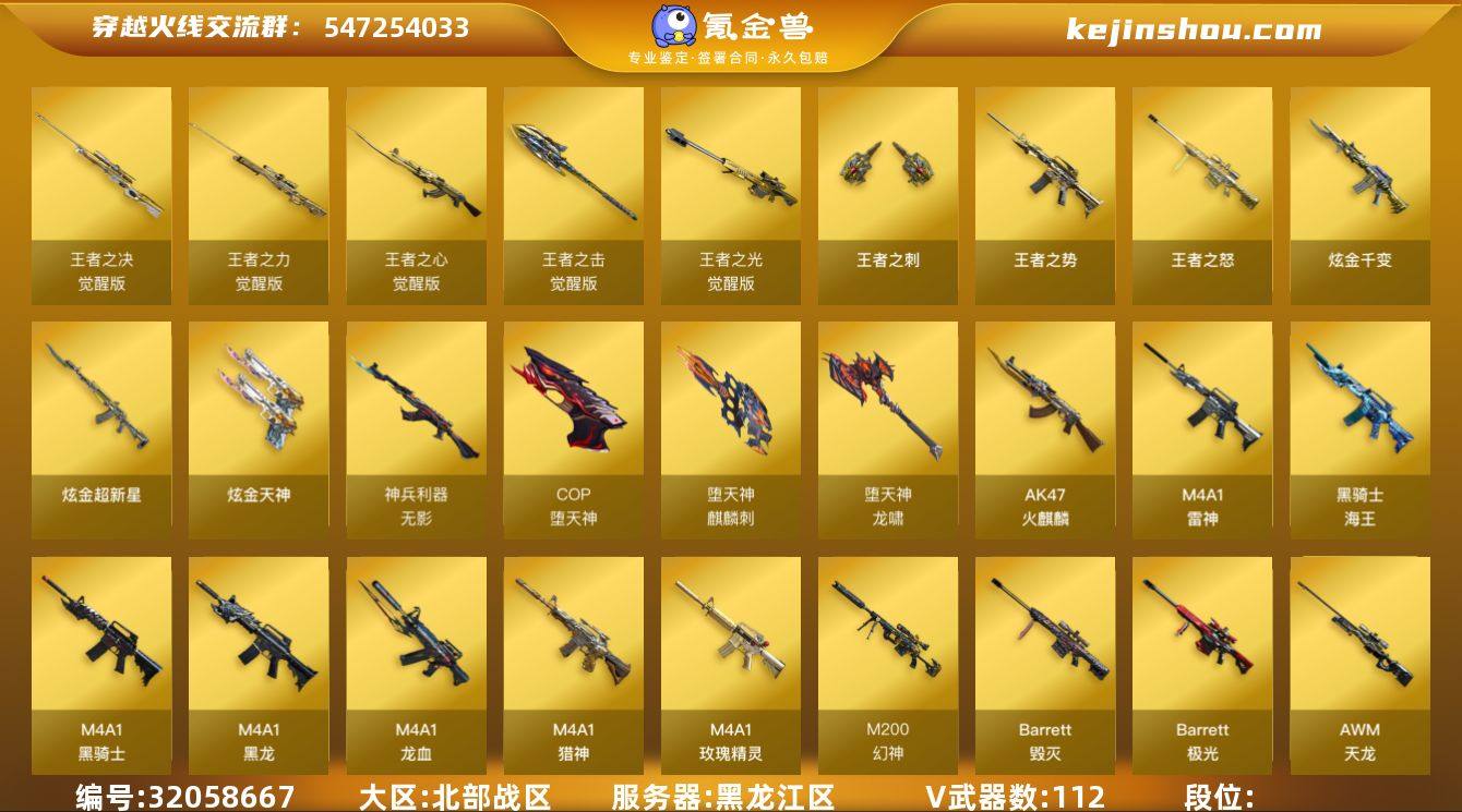 【14】112V/102级/荣耀元首/10王者/3炫金/3英雄/QBZ03-金色蔷薇/M200-幻神/死亡之眼/M4A1-黑骑士/汤姆逊-烈龙/斯泰尔蝴蝶/USP雷暴/COP-堕天神/沙鹰-修罗/蝴蝶斯泰尔+6烈龙/王者之势/王者之怒/王者之刺/炫金千变/炫金超新星/炫金天神/AK47-火麒麟音效卡/M4A1-雷神音效卡/M4A1-黑骑士音效卡/Barrett-毁灭音效卡/Barrett-极光音效卡/Barrett-碧霄极光音效卡/幻神-AG-CFPLS17冠军/雷神-星空/雷神冠军之魄/雷神-传奇N9/雷神-杨戬/AK47-火麒麟-传奇EVEN/火麒麟-轻羽皮肤/传奇石头-横秒之巅/火麒麟-平天大圣/火麒麟-心动糖果/毁灭-CFS2020/毁灭-黑大圣皮肤/M4A1-千变-孔明皮肤/黑龙-能量核心/黑龙-暗月/M4A1-黑龙-361/黑龙-冠军之武/黑骑士-耀金皮肤/黑骑士-冠军之势/黑骑士-战神马超/无影耀金皮肤/AK47-B-常胜将军-曹操/AK47-B-常胜将军-刘备/AK47-B-常胜将军-孙权/AWM-天龙-传奇70KG/极光-能量核心/修罗-星空/屠龙-荣耀之锋/龙啸-冠军之啸/樱/炫/迷迭香/王者樱-热浪之夏/王者-葵-貂蝉/王者春/王者涂鸦/乔伊教练/修道士/风暴女/嘉年华灵狐/娟娟/零-热舞青春/灵狐者-X/灵狐者-黄金海岸/灵狐者-职业经理/邱刚敖/斯沃特-X/蜀雪/铁骑荣耀/职业选手/天龙-曼陀罗/巴雷特-零-水下丽影/AWM-灵狐-15周年嘉年华/迷你深渊冰龙/闪光弹-貂蝉/高爆手雷-大乔/灵狐娃娃手雷/6烈龙/冰龙粉碎者-白马银枪/神圣爆裂者-末日/AK47-火麒麟/M4A1-黑龙/M4A1-雷神/AK12-天启/M4A1-龙血/无影-神兵利器/M4A1-玫瑰精灵/M4A1-猎神/王者之心-觉醒版/AK-47-猩红传说/黑骑士-海王/AK47-B-常胜将军/AWM-天龙/Barrett-毁灭/Barrett-极光/AWM-裁决/Barrett-金色蔷薇/王者之光-觉醒版/王者之力-觉醒版/王者之决-觉醒版/AA-12-雷霆/柯尔特-电竞装甲/屠龙/龙啸/麒麟刺-堕天神/擎天/麒麟刺/幻灵之锋/龙啸-堕天神/斩神刀-雷暴/王者之击-觉醒版/高爆手雷-雷暴/高爆...