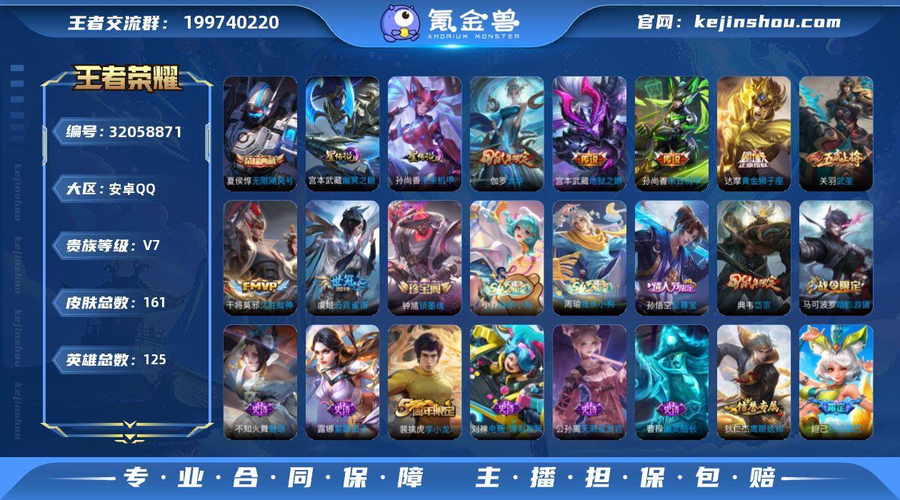 安卓Q-V7-最强王者段位-发育路16段,打野14段,2星元幽冥之眼,未来机甲,125英雄-161皮肤-1典藏皮肤-7传说-36史诗 【荣耀典藏】:夏侯惇无限飓风号 【传说皮肤】:关羽武圣,伽罗太华,干将莫邪久胜战神,虞姬云霓雀翎,达摩黄金狮子座,孙尚香末日机甲,宫本武藏地狱之眼 【限定皮肤】:白起狰,狄仁杰阴阳师,虞姬凯尔特女王,赵云皇家上将,妲己热情桑巴,孙膑妖精王,扁鹊炼金王,芈月重明,夏侯惇朔风刀,甄姬游园惊梦,曹操烛龙,典韦穷奇,典韦岱宗,马可波罗暗影游猎,狄仁杰魔术师,狄仁杰万华元夜,项羽海滩派对,老夫子醍醐杖,关羽武圣,程咬金演武夺筹,兰陵王金庭之子,孙悟空至尊宝,牛魔御旌,钟馗驱傩正仪,杨玉环遇见飞天,蔡文姬繁星吟游,太乙真人饕餮,鬼谷子原初探秘者,苏烈千军破阵,弈星混沌棋,明世隐疑决卦,裴擒虎李小龙,裴擒虎擒涛扼浪,狂铁御狮,米莱狄御霄,伽罗太华,盾山御銮,猪八戒西部大镖客,上官婉儿梁祝,鲁班大师探海日志,桑启海盐诗旅 【年限皮肤】:伽罗太华,典韦岱宗 【赛季限定】:孙膑妖精王,扁鹊炼金王,虞姬凯尔特女王,白起狰,太乙真人饕餮,曹操烛龙,芈月重明,典韦穷奇,狂铁御狮,米莱狄御霄,牛魔御旌,盾山御銮,夏侯惇朔风刀,弈星混沌棋,明世隐疑决卦,老夫子醍醐杖,鬼谷子原初探秘者,狄仁杰万华元夜,程咬金演武夺筹,钟馗驱傩正仪,苏烈千军破阵,兰陵王金庭之子,桑启海盐诗旅,裴擒虎擒涛扼浪,鲁班大师探海日志 【战令限定】:马可波罗暗影游猎,猪八戒西部大镖客,周瑜线条小狗,小乔线条小狗 【史诗皮肤】:钟馗锁墨魂,周瑜线条小狗,小乔线条小狗,刘禅电玩爆裂旋风,裴擒虎李小龙,马可波罗暗影游猎,不知火舞魅语,典韦岱宗,蔡文姬繁星吟游,上官婉儿梁祝,公孙离无限星赏官,狄仁杰鹰眼统帅,杨玉环遇见飞天,阿轲节奏热浪,白起...