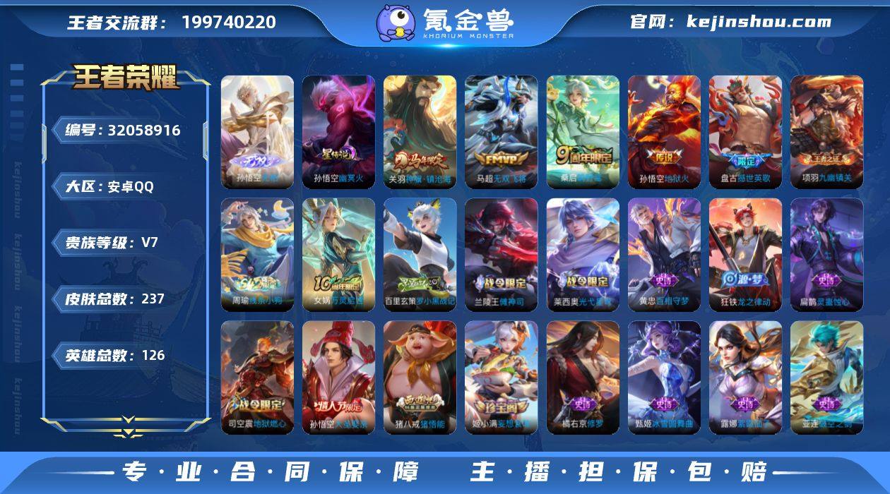 安卓Q-V7-最强王者段位-126英雄-237皮肤-1无双-4传说-64史诗,打野27段,对抗路25 幸运值258 【无双皮肤】:孙悟空无相 【传说皮肤】:关羽神骥镇沧海,桑启鸣野蒿,马超无双飞将,孙悟空地狱火 【限定皮肤】:姜子牙天穹之誓,李白谪仙醉月,狄仁杰阴阳师,赵云皇家上将,孙尚香蔷薇恋人,庄周高山流水,钟无艳王者之锤,钟无艳超时空战士,元歌无心,夏侯惇朔风刀,甄姬落雪兰心,狄仁杰魔术师,狄仁杰万华元夜,达摩沙漠行僧,项羽海滩派对,老夫子醍醐杖,程咬金演武夺筹,兰陵王金庭之子,孙悟空美猴王,孙悟空大圣娶亲,李元芳银河之约,李元芳云中旅人,钟馗驱傩正仪,干将莫邪胡桃夹子,鬼谷子原初探秘者,鬼谷子五谷丰年,苏烈千军破阵,百里玄策原初追逐者,弈星混沌棋,沈梦溪大漠名商,明世隐疑决卦,裴擒虎李小龙,裴擒虎擒涛扼浪,云中君纤云弄巧,盾山御銮,猪八戒猪悟能,上官婉儿梁祝,鲁班大师探海日志,桑启海盐诗旅,艾琳流音漫舞,司空震地狱燃心,阿古朵江河有灵,张良古海寻踪,蒙犽百解令,蒙恬荣光圣徽,鬼谷子天穹祈灯,姬小满妄想食味,沈梦溪龙舞盛年,周瑜熔金海岸 【年限皮肤】:孙悟空美猴王 【赛季限定】:盾山御銮,夏侯惇朔风刀,弈星混沌棋,明世隐疑决卦,老夫子醍醐杖,鬼谷子原初探秘者,狄仁杰万华元夜,程咬金演武夺筹,钟馗驱傩正仪,苏烈千军破阵,达摩沙漠行僧,兰陵王金庭之子,沈梦溪大漠名商,李元芳云中旅人,桑启海盐诗旅,裴擒虎擒涛扼浪,鲁班大师探海日志,张良古海寻踪,鬼谷子天穹祈灯,姜子牙天穹之誓,东皇太一噬灭天穹,太乙真人谧流熔炉,钟馗虚灵犬护,甄姬逆浪荇歌,亚瑟荣光之誓,百里玄策原初追逐者,蒙恬荣光圣徽,项羽九幽镇关 【战令限定】:李元芳银河之约,钟无艳超时空战士,甄姬落雪兰心,司空震地狱燃心,艾琳流音漫舞,亚连破空之剑,孙悟...