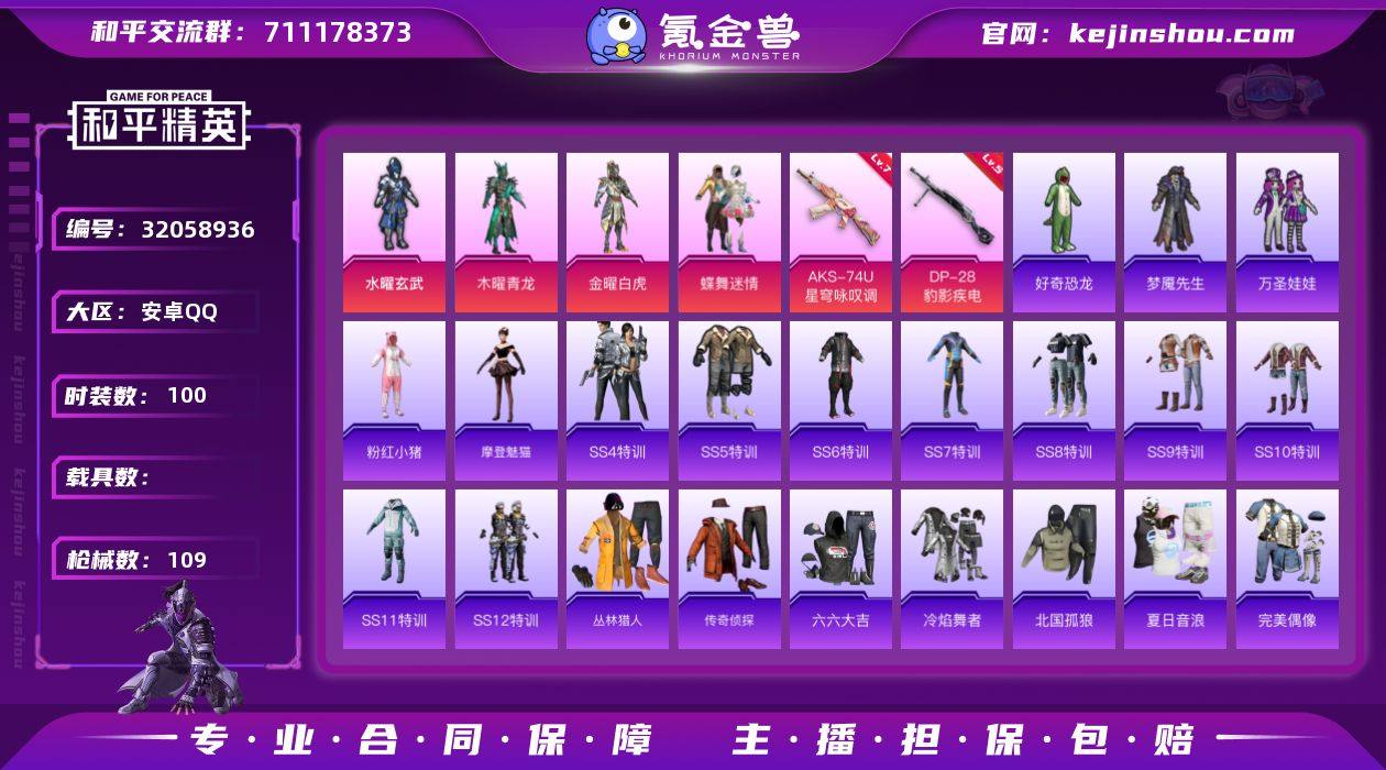 安卓 手Q-4粉装-2特效枪-0载具-1粉色飞行器-31283热力值-3王牌印记-100套装-109枪皮 【热门品类】:套装-粉红小猪 【粉色套装】:粉装-水曜玄武,粉装-木曜青龙,粉装-金曜白虎,粉装-蝶舞迷情 【粉色枪皮等级】:AKS-74U-星穹咏叹调(七级),DP-28-豹影疾电(五级) 【粉色枪皮】:AKS-74U-星穹咏叹调,DP-28-豹影疾电 【粉色降落伞】:至尊龙雀降落伞,古堡领主降落伞,伏魔团降落伞,星穹咏叹调降落伞,冷漠罗丽降落伞,异瞳寒姬降落伞,炫彩糖果降落伞 【稀有套装】:套装-炫彩糖果,角色-摩登魅猫 【稀有枪皮】:AKM-灼热熔岩,AKM-玉龙,AKM-霓虹街区,M16A4-夜灯,SCAR-L-金风玉露,SCAR-L-冷漠罗丽,M416-夜灯,M416-红色方程式,GROZA-生命誓言,QBZ-诡娃娃,M762-牛气冲天,M762-诡娃娃,UZI-古堡领主,UZI-天降萌叽,UZI-红色方程式,UMP45-夜灯,UMP45-生命誓言,UMP45-蓝色火焰,UMP45-诡娃娃,Vector-生命誓言,汤姆逊-勇闯险境,汤姆逊-智耀战神,Kar98K-勇闯险境,Kar98K-红色方程式,M24-冰封烈焰,SKS-勇闯险境,SKS-夜灯,SKS-炫彩节奏,SKS-诡娃娃,VSS-彩虹符号,Mini14-炫彩节奏,Mini14-金鼠迎春,S686-冰封烈焰,S686-深海曼妙,S686-生命誓言,S1897-勇闯险境,S1897-天启纪元,S1897-神秘黑猫,S12K-破晓战魂,S12K-夜灯,S12K-幻世战舞者,DBS-彩虹符号,M249-彩虹符号,M249-破晓战魂,DP-28-潮萌小黄鸭,MG3-幻世战舞者,P1911-冰封烈焰,短管霰弹-星穹咏叹调,爆炸猎弓-喜羊羊与灰太狼,大砍刀-粉色回忆 【其他套装】:套装-SS4特训,套装-SS5特训,套装-SS6特训,套装-SS7特训,套装-SS8特训,套装-SS9特训,套装-SS10特训,套装-SS11特训,套装-SS12特训,套装-丛林猎人,套装-传奇侦探,套装-六六大吉,套装-冷焰舞者,套装-北国孤狼,套装-夏日音浪,套装-好奇恐龙,套装-完美偶像...