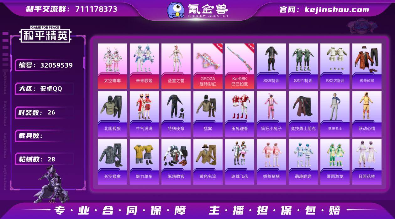 安卓 手Q-3粉装-2特效枪-0载具-1粉色飞行器-11656热力值-1王牌印记-26套装-28枪皮 【粉色套装】:粉装-太空嘟嘟,粉装-未来歌姬,角色-圣堂之誓 【粉色枪皮等级】:GROZA-旋转彩虹(六级),Kar98K-巳巳如意(二级) 【粉色枪皮】:GROZA-旋转彩虹,Kar98K-巳巳如意 【粉色飞行器】:太空嘟嘟飞行器 【粉色降落伞】:梦幻火箭降落伞 【稀有枪皮】:AKM-春暖花开,SCAR-L-幽秘魅影,SCAR-L-炫彩节奏,SCAR-L-玉兔迎春,M416-红色方程式,M416-绯红前夜,AC-VAL-天降萌叽,AC-VAL-彩虹甜喵,蜜獾-娇憨猪猪,UZI-娇憨猪猪,Kar98K-王子的夏天,SLR-娇憨猪猪,S686-红色方程式,S1897-炫彩节奏,S12K-音爆索尼克,S12K-垂柳戏鸭,S12K-娇憨猪猪,沙漠之鹰-旋转彩虹 【其他套装】:套装-SS6特训,套装-SS21特训,套装-SS22特训,套装-传奇侦探,套装-北国孤狼,套装-牛气满满,套装-特殊使命,套装-猛禽,套装-玉兔迎春,套装-疯狂小兔子,套装-竞技勇士朋克,套装-竞技名士,套装-跃动心情,套装-长空猛禽,套装-魅力单车,套装-麻辣教官,套装-黄色名流,套装-玲珑飞花,套装-娇憨猪猪,套装-萌趣咩咩,套装-夏雨游龙,套装-日照花林 【稀有头盔】:金风玉露头盔(2级) 【营地ID】:1040652445