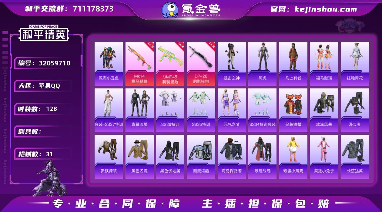 实名: 可修改 时装数: 128 枪械数: 31 战备数: 25 热门装扮: 呆萌铁蟹,深海小丑鱼 稀有枪皮:UMP45-萌骑冒险(四级),Mk14-福马献瑞(五级),DP-28-豹影疾电(三级)