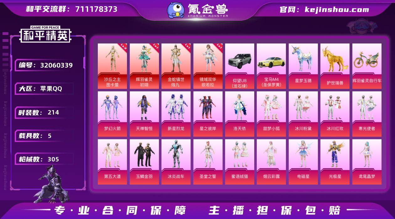 苹果 手Q-4神装-31粉装-44特效枪-5载具-15粉色飞行器-129147热力值-14王牌印记-214套装-305枪皮 【红色神装等级】:辉羽雀灵-初翊(一级),金蛇镇世-烛九(一级),镜域双华-欧若拉(一级),沙丘之主-图卡盟(三级) 【红色角色神装】:辉羽雀灵-初翊,金蛇镇世-烛九,镜域双华-欧若拉,沙丘之主-图卡盟 【热门品类】:粉装-梦幻火箭,套装-星河浪客,套装-SS1特训,套装-龟仙人,套装-暗影哥特,角色-8号机,角色-Mark.06 【粉色套装】:粉装-梦幻火箭,粉装-天禅智恒,粉装-新星烈龙,粉装-星之彼岸,角色-洛天依,粉装-甜梦小狐,粉装-冰川粉黛,粉装-冰川红玫,粉装-寒光使者,粉装-第五大道,粉装-玉鳞金羽,角色-冰炎战车,角色-圣堂之誓,粉装-蜜语绒猫,角色-烟云彩露,角色-电磁星,角色-光极星,角色-鸢尾晶梦,角色-初号机 觉醒Ver.,粉装-金丰海韵,角色-千金淑猫,角色-月影灵韵,角色-萨利娅,粉装-幻影飞狐,角色-彩虹独角兽,角色-翎光蝶翼,粉装-桃粉嫣然,角色-智耀战神,粉装-星穹咏叹调,粉装-幻彩电音,角色-狂魅哈莉 【粉色枪皮等级】:AKM-梦之光华(四级),AKM-绿萝繁花(五级),SCAR-L-锦绣绵绵(五级),SCAR-L-金蛇镇世(三级),M416-至情至圣(六级),M416-电玩时刻(五级),M416-墨龙九天(三级),GROZA-精灵之光(三级),GROZA-镜光银凌(五级),AUG-甜心首席(三级),AUG-暖羊咩咩(五级),M762-青锋波束(五级),M762-鬼刀(四级),Famas-翎光蝶翼(四级),ARX-无垠阁(四级),Vector-灵感创作师(五级),AKS-74U-信仰神谕(五级),AKS-74U-星穹咏叹调(一级),P90-沙丘之主(六级),P90-金丰海韵(一级),Kar98K-巳巳如意(五级),AWM-湮灭星辰(三级),Mk14-精灵梦叶罗丽(五级),Mk14-甜梦熊击(五级),Mk14-福马献瑞(五级),AMR-智耀战神(五级),M417-第五大道(一级),M200-玉鳞金羽(四级),SVD-月影灵韵(四...