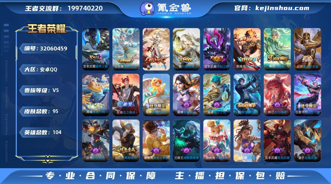 安卓Q-V5-永恒钻石V段位-104英雄-95皮肤-7传说-19史诗 【传说皮肤】:公孙离云诺千山,澜愿照九州拓,裴擒虎祥瑞亨通,桑启鸣野蒿,镜炽阳神光,后羿黄金射手座,宫本武藏地狱之眼 【限定皮肤】:姜子牙天穹之誓,狄仁杰阴阳师,赵云皇家上将,项羽海滩派对,雅典娜单词大作战,鲁班大师探海日志,张良古海寻踪 【年限皮肤】:澜愿照九州拓 【赛季限定】:鲁班大师探海日志,张良古海寻踪,姜子牙天穹之誓,东皇太一噬灭天穹,太乙真人谧流熔炉,钟馗虚灵犬护 【战令限定】:雅典娜单词大作战,亚连破空之剑,孙悟空神迹守卫,百里守约百相守梦,老夫子百相守梦,刘禅鸭鸭历险记,沈梦溪鸭鸭历险记,周瑜线条小狗 【史诗皮肤】:周瑜线条小狗,狂铁龙之律动,刘禅鸭鸭历险记,百里守约百相守梦,亚连破空之剑,姬小满战舞者,狄仁杰鹰眼统帅,铠曙光守护者,诸葛亮黄金分割率,兰陵王暗隐猎兽者,张飞乱世虎臣,吕布末日机甲,墨子金属风暴,妲己女仆咖啡,妲己魅力维加斯,孙尚香水果甜心,宫本武藏鬼剑武藏,廉颇地狱岩魂,赵云皇家上将,露娜紫霞仙子 【其他皮肤】:白起死霸装,姬小满小满鸭,露娜命运加冕,阿古朵布丁狗之约,张良灵野札记,苏烈春野闲踪,沈梦溪鸭鸭历险记,钟馗虚灵犬护,刘备浪漫序章,戈娅玫蓝誓约,东皇太一金福满堂,西施雪境奇遇,典韦铁骨偃魂,太乙真人谧流熔炉,苍苍林狼骑,干将莫邪雾都夜雨,老夫子百相守梦,东皇太一噬灭天穹,盘古敬我三分,孙悟空神迹守卫,姜子牙天穹之誓,张良古海寻踪,鲁班大师探海日志,鲁班大师乓乓大师,雅典娜单词大作战,吕布野性能量,小乔丁香结,李白敏锐之力,诸葛亮掌控之力,王昭君幻想奇妙夜,关羽龙腾万里,狄仁杰阴阳师,后羿阿尔法小队,宫本武藏万象初新,甄姬花好人间,张飞五福同心,亚瑟死亡骑士,典韦黄金武士,扁鹊救世之瞳,白起...