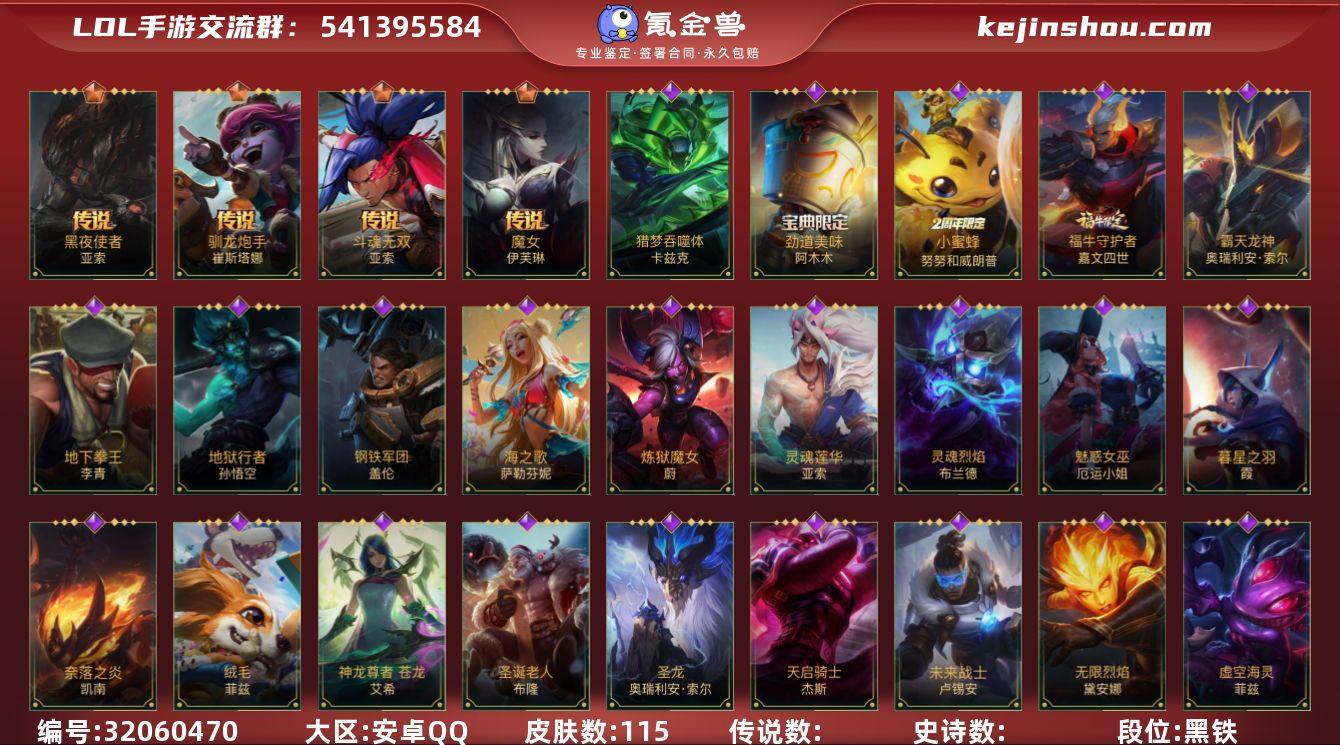【LOLSYH348】105英雄/115皮肤/华贵铂金/渔帆满载 亚索/魔女伊芙琳/黑夜使者亚索/神龙尊者 昼日真龙 亚索/斗魂无双亚索/驯龙炮手/钢铁军团/劲道美味 阿木木/小蜜蜂努努和威朗普/地狱行者猴子/探梦奇旅艾克/无限烈焰/猎梦吞噬体 卡兹克/蕊雪盈春:晏安 赫卡里姆/圣诞老人/源计划:升华/霸天龙神龙王/圣龙/海之歌萨勒芬妮/战场之王亚索/灵魂莲华亚索/屠龙勇士凯尔/未来战士卢锡安/炼狱魔女/暮星之羽/源代码青钢影/福牛守护者皇子/地下拳王/奈落之炎/魅惑女巫女枪/泳池派对男枪/神龙尊者 苍龙/暗星墨菲特/虚空海灵/绒毛/战场之王炸弹人/玉剑传说 武剑仙/霸天战鹰加里奥/天启骑士/战地机甲 厄加特/霸天战车螃蟹/灵魂烈焰/泳池派对鳄鱼/黯晶巨兽/欧米伽小队 天雷爆破手 维迦/怨之砂/盗梦暗影/宇航员/游梦仙境 莉莉娅/雷霆领主奥恩/s2光耀之芒/s5绯金魅影/s6绯金丽刃/s7绯金战斧/s8绯金鮫灵/s9王牌舰长/s10王牌上将/s11王牌司令/s12龙冕先锋/s13龙冕御盾/s14龙冕神策/s15龙冕异士/S18冠翎巨神像/死亡骑士/海上霸主/游侠法师/暗黑武士狮子狗/斗战胜佛/时之砂/国王/秘密特工/龙冕先锋赵信/死亡绽放/末路狂花/光耀之芒金克丝/猎龙勇士布隆/狮心/龙冕御盾布隆/龙冕异士戏命师/王牌舰长/绯金魅影(可升级)/钢铁意志/皇家守卫/绯金丽刃(可升级)/擂台皇帝/西部牛仔亚索/腥红之月亚索/偶像歌手/焰尾妖狐/宗师级钓鱼训练师/烧烤女神/邪恶女巫/冰霜亚龙/黯黑魔龙龙女/女警官/王牌上将皇子/超级英雄/超武乾坤:电弧/熔火之心/创世魔神/单身贵族/西部牛仔女枪/暗影/热血班长/黑暗骑士男枪/金牌主播/绯金战斧(可升级)/极地女神/黑暗骑士寒冰/王牌司令艾希/哞利斯塔/无畏号/龙冕神策吉格斯/鲛泥座人/河水之灵/绯金鮫灵(可升级)/苍穹之光韦鲁斯/冰霜之刃/莲花之令刀妹/冠翎巨神像 加里奥/蔷薇绅士杰斯/先驱行者/黑暗骑士奥拉夫/...