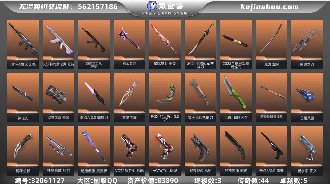 YY -仓库价值83890,剩余R点25,剩余点券126 英雄28,黄金lll 【极品大物资黄金毕业号 24冠军+多刀皮】 套装:(2024全球冠军赛,2022全球冠军赛,双城收藏,起点 2.0,塑水(缺飞将),) 热门皮肤:(侦查幻影,塑水狂徒,混沌狂徒,黑波之刃,千灵幻影,猫猫狂徒,洪荒狂徒,显卡爪刀,起点蝴蝶刀,落英飞旋,塑水正义,黯夜幻影,显卡狂徒,鬼丸国纲,掠影戍卫,25狂徒,创纪元狂徒,781幻影,混沌讽刺,偃月冥驹等) 其他皮肤/卡面/挂饰等请看截图,限时道具/段位等以实际验号为准,如账号因没有维护、赛季更新等不可抗因素发生变化,不属于账号质量问题