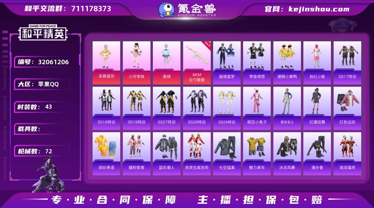 苹果 手Q-3粉装-2特效枪-0载具-0粉色飞行器-19782热力值-3王牌印记-43套装-72枪皮 【热门品类】:套装-潮萌小黄鸭,套装-粉红小猪 【粉色套装】:角色-呆萌星弥,角色-小可学妹,角色-美琪 【粉色枪皮等级】:AKM-白勺歌姬(七级) 【粉色枪皮】:AKM-白勺歌姬,Mk14-福马献瑞 【粉色降落伞】:白勺歌姬降落伞,江南烟雨降落伞,精灵梦叶罗丽降落伞,忍者神龟降落伞,炫彩糖果降落伞 【稀有套装】:套装-画境星梦,套装-琴音绮想,套装-雨过天青,套装-红釉青花 【稀有枪皮】:AKM-彩虹符号,AKM-江南烟雨,AKM-虎虎生威,SCAR-L-炫彩节奏,M416-蓝色火焰,GROZA-蓝莓炮弹,AUG-天降萌叽,QBZ-彩虹符号,QBZ-洛神天依,M762-瑞龙福将,蜜獾-天降萌叽,ACE32-画境星梦,UZI-天降萌叽,UZI-影袭,UMP45-海渊国主,Vector-焰鹰斗篷,Vector-暗夜玫瑰,汤姆逊-天降萌叽,MP5K-蓝莓炮弹,MP5K-画境星梦,Kar98K-洛神天依,AWM-焰鹰斗篷,Mini14-耀粉歌者,Win94-瑞龙福将,AMR-白勺歌姬,M1加兰德-画境星梦,S12K-瑞龙福将,DBS-焰鹰斗篷,AA12-G-画境星梦,M249-镭射皇者,DP-28-焰鹰斗篷,DP-28-彩虹符号,MG3-幻世战舞者,MG3-瑞龙福将,TMP-9-江南烟雨,战术弩-江南烟雨,平底锅-画境星梦 【其他套装】:套装-SS17特训,套装-SS18特训,套装-SS19特训,套装-SS27特训,套装-SS28特训,套装-SS29特训,套装-疯狂小兔子,套装-竞技名士,套装-粉红小猪,套装-红潮炫舞,套装-红色运动,套装-缤纷果语,套装-耀粉歌者,套装-蓝彩潮人,套装-虎虎生威吉莉,套装-长空猛禽,套装-魅力单车,套装-冰冻风暴,套装-漫步者,套装-潮萌小黄鸭,套装-瑞龙福将,套装-团圆交子,套装-天籁歌者,角色-零款战斗服,套装-冰爽风暴,套装-香榭午后,套装-焰鹰斗篷,套装-幻羽潜行,角色-湖雨初晴 【稀有背包】:金羽特工背包(1级) 【...