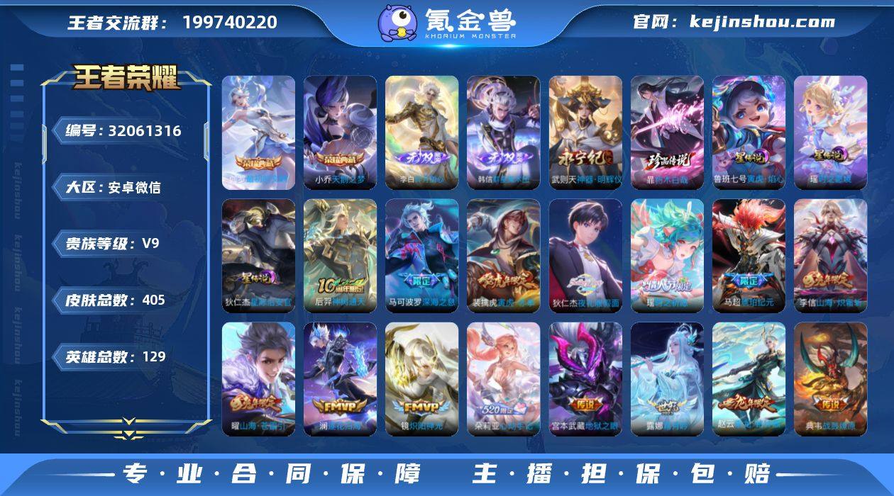 安卓WX-V9-最强王者段位-129英雄-405皮肤-2典藏皮肤-1典藏英雄-3无双-1珍品传说-42传说-123史诗,打野37段,发育路35 【英雄全皮】:孙权全皮,蒙恬全皮,镜全皮,金蝉全皮,莱西奥全皮,戈娅全皮,空空儿全皮,影全皮,海诺全皮 【荣耀典藏】:武则天英雄,小乔天鹅之梦,伽罗最初的交响 【无双皮肤】:韩信群星魔术团,李白碎月剑心,武则天神器明辉仪 【珍品传说】:暃朽木白哉 【传说皮肤】:后羿神树通天,朵莉亚心动手记,典韦战鼓燎原,赵云乘龙铭钟鼎,马超琥珀纪元,铠琥珀纪元,澜逐花归海,露娜霜月吟,孙膑小动物乐团,狄仁杰夜礼服假面,王昭君永恒水手月亮,甄姬至美化雀舞,兰陵王影龙天霄,宫本武藏惊梅引,东皇太一灼幽烈阳,诸葛亮鹤羽星尊,澜电玩雷克斯,虞姬无限倾心,孙悟空齐天大圣,曜山海苍雷引,李信山海炽霜斩,李白诗剑行,马可波罗深海之息,大乔挚爱花嫁,孙策挚爱之约,蔡文姬花朝如约,孙策末日机甲,瑶时之祈愿,裴擒虎寅虎赤拳,鲁班七号寅虎瑞焰,赵云淬星耀世,王昭君乞巧织情,西施游龙清影,李元芳飞鸢探春,镜炽阳神光,虞姬启明星使,曜云鹰飞将,虞姬云霓雀翎,花木兰冠军飞将,后羿黄金射手座,宫本武藏地狱之眼,狄仁杰超时空战士 【限定皮肤】:狄仁杰阴阳师,廉颇寅虎御盾,赵云皇家上将,赵云百木心枪,墨子降魔,鲁班七号寅虎瑞焰,钟无艳超时空战士,白起夜都怪侠,芈月幻夜卜梦,吕布猎兽之王,元歌无心,甄姬女儿国国王,甄姬落雪兰心,甄姬至美化雀舞,马可波罗深海之息,狄仁杰魔术师,达摩沙漠行僧,项羽海滩派对,关羽冰锋战神,韩信傲雪梅枪,王昭君午后时光,兰陵王影龙天霄,兰陵王金庭之子,花木兰瑞麟志,孙悟空齐天大圣,后羿圣弓游侠,李元芳匿光侦查者,李元芳云中旅人,虞姬启明星使,虞姬无限倾心,杨戬潮玩骑兵,雅典娜黎明之约,诸葛亮鹤羽星...