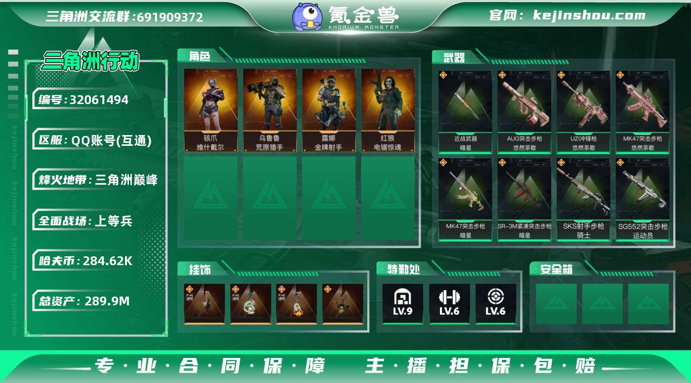 实名:不可二次实名 总资产:289.9M 哈夫币:284.62K 烽火地带段位:三角洲巅峰 烽火地带等级:60 全面战场段位:上等兵 全面战场等级:39 9级仓库,6级训练中心,6级靶场,5级指挥中心,1级潜水中心,3级防具台,3级工作台,3级制药台,3级技术中心,1级收藏室 战术部门等级:3 战斗部门等级:2 医疗部门等级:2 研发部门等级:2 后勤部门等级:2 曼德尔砖-气象感应:0 曼德尔砖-命运王牌:0 曼德尔砖-电玩高手:0 曼德尔砖-美杜莎:0