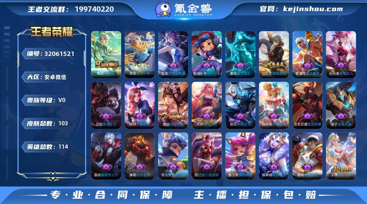 贵族等级:V0 典藏皮肤数:0 珍品无双皮肤数:0 无双皮肤数:0 珍品传说皮肤数:0 传说皮肤数:1 史诗皮肤数:21 皮肤数:103 英雄数:114 段位:钻石 卖家说:安卓微信 武则天 103皮肤 可二次实名 全满级铭文 安全号 商品详情 安卓微信区,无贵族。 英雄武则天,嬴政,赵云,敖隐。 总皮肤:103个。 铭文:全满级150铭文,多套通用。 实名状态:可二次实名,换绑安全。 无封禁,无违规,可正常换绑手机。 资料齐全,平台验号交易,非诚勿扰。