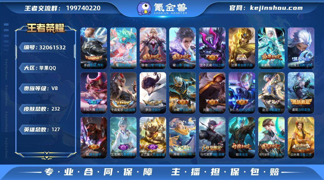 苹果Q-V8-永恒钻石IV段位-127英雄-232皮肤-1典藏皮肤-16传说-62史诗 【荣耀典藏】:李白鸣剑曳影 【传说皮肤】:曜山海苍雷引,李信山海炽霜斩,李白诗剑行,不知火舞绯月行,孙策末日机甲,瑶时之祈愿,赵云淬星耀世,兰陵王默契交锋,诸葛亮时雨天司,铠绛天战甲,虞姬启明星使,刘备时之恋人,干将莫邪久胜战神,达摩黄金狮子座,宫本武藏地狱之眼,狄仁杰超时空战士 【限定皮肤】:白起狰,狄仁杰阴阳师,虞姬凯尔特女王,赵云皇家上将,墨子降魔,孙尚香蔷薇恋人,鲁班七号狮舞东方,高渐离死亡摇滚,高渐离玩趣恶龙,钟无艳超时空战士,扁鹊炼金王,芈月重明,元歌无心,夏侯惇朔风刀,夏侯惇匿光决锋者,甄姬落雪兰心,曹操烛龙,典韦穷奇,马可波罗逐梦之星,马可波罗暗影游猎,马可波罗山海玄木吟,狄仁杰魔术师,狄仁杰万华元夜,项羽海滩派对,老夫子醍醐杖,程咬金演武夺筹,韩信逐梦之影,韩信飞衡,韩信傲雪梅枪,王昭君午后时光,兰陵王默契交锋,兰陵王金庭之子,花木兰默契交锋,不知火舞绯月行,牛魔御旌,李元芳云中旅人,虞姬启明星使,钟馗神迹守卫,钟馗驱傩正仪,雅典娜单词大作战,太乙真人饕餮,鬼谷子原初探秘者,鬼谷子五谷丰年,诸葛亮时雨天司,铠青龙志,百里守约朱雀志,弈星混沌棋,公孙离玉兔公主,明世隐疑决卦,裴擒虎李小龙,裴擒虎擒涛扼浪,狂铁御狮,米莱狄御霄,瑶时之祈愿,云中君纤云弄巧,李信山海炽霜斩,伽罗天狼溯光者,盾山御銮,猪八戒西部大镖客,上官婉儿梁祝,嫦娥拒霜思,嫦娥暖冬兔眠,曜山海苍雷引,蒙犽狂想玩偶喵,鲁班大师探海日志,桑启海盐诗旅,暃星界游侠,张良古海寻踪,鬼谷子天穹祈灯,刘邦剑破天穹,程咬金群星魔术团,刘备异域游侠 【年限皮肤】:百里守约朱雀志,铠青龙志,韩信飞衡,诸葛亮时雨天司,曜山海苍雷引,李信山海炽霜斩,马可波...
