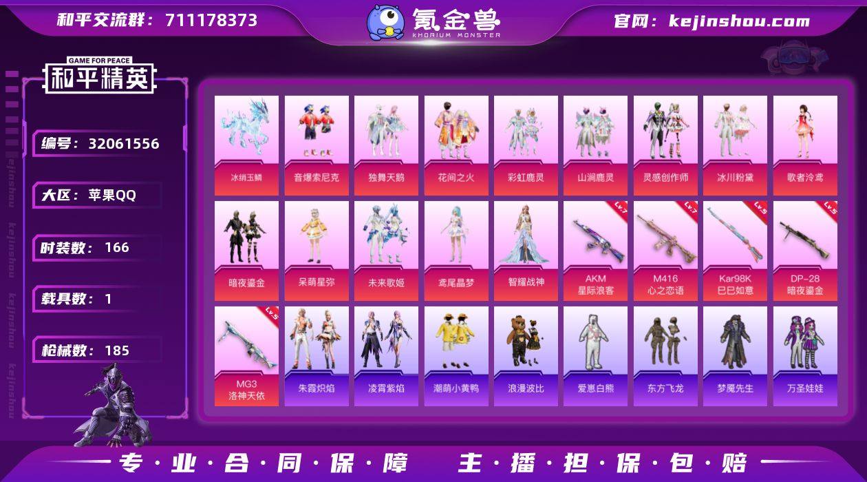 苹果 手Q-13粉装-5特效枪-1载具-3粉色飞行器-64114热力值-14王牌印记-166套装-185枪皮 【热门品类】:粉装-音爆索尼克,套装-SS1特训,套装-龟仙人,套装-潮萌小黄鸭,套装-暗影哥特,套装-浪漫波比,熔岩游骑兵连帽夹克 【粉色套装】:粉装-独舞天鹅,粉装-花间之火,粉装-彩虹鹿灵,粉装-山涧鹿灵,粉装-灵感创作师,粉装-冰川粉黛,角色-歌者泠鸢,粉装-暗夜鎏金,粉装-音爆索尼克,角色-呆萌星弥,粉装-未来歌姬,角色-鸢尾晶梦,角色-智耀战神 【粉色枪皮等级】:AKM-星际浪客(七级),M416-心之恋语(七级),Kar98K-巳巳如意(五级),DP-28-暗夜鎏金(五级),MG3-洛神天依(五级) 【粉色载具】:冰绡玉鳞 【粉色枪皮】:AKM-星际浪客,M416-心之恋语,Kar98K-巳巳如意,DP-28-暗夜鎏金,MG3-洛神天依 【粉色飞行器】:王牌四分卫飞行器,歌者泠鸢飞行器,灵珠游龙飞行器 【粉色降落伞】:神秘黑猫降落伞,王牌四分卫降落伞,林间仙鹿降落伞,洛神天依降落伞,歌者泠鸢降落伞,暗夜鎏金降落伞,精灵梦叶罗丽降落伞,鬼刀降落伞,魔童闹海 敖丙降落伞 【稀有套装】:套装-龟仙人,套装-糖糖葫芦,套装-青团波波,角色-俏兔智灵,角色-光矢逐梦,套装-燕燕于飞,套装-鱼渊荷华,套装-风舞幻音,套装-紫幽梦,套装-蓝冰羽,套装-星影赞美诗,套装-霓虹热舞,套装-朱霞炽焰,套装-凌霄紫焰 【稀有枪皮】:AKM-夜灯,AKM-彩虹符号,AKM-破晓战魂,AKM-萌趣颜团子,AKM-霓虹街区,AKM-龙的传人,M16A4-红色方程式,SCAR-L-生命誓言,SCAR-L-雷霆特警,SCAR-L-黄金龙骨,M416-神秘黑猫,M416-糯团青竹,M416-红色方程式,M416-蓝色火焰,GROZA-南瓜骑士,GROZA-异彩先驱,GROZA-彩虹符号,GROZA-懵萌河马,GROZA-林间仙鹿,GROZA-治愈之星,GROZA-生命誓言,GROZA-田园牧歌,GROZA-雷霆特警,AUG-天降萌叽,AUG-纯梦嫁纱...