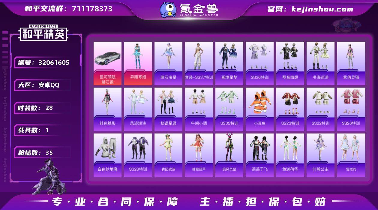 【和平精英】2粉装,5特效枪,1载具,历史最高段位:传奇王牌9星 王牌印记2次 热力值:35633,87套装,123枪械,132装备,61战备;套装:角色-异瞳寒姬,角色-绝对恒星,套装-猎鹰,套装-青年教官,套装-橘黑制服,套装-红色运动,套装-黄色运动,套装-蓝色运动,套装-黄色伏地魔,套装-白色伏地魔,套装-黑色伏地魔,套装-竞技名士,套装-湖蓝色名流,套装-黄色名流,套装-猛禽,套装-野性山猫,套装-长空猛禽,套装-海岛探路者,套装-旭日情侣,套装-灼焰舞者,套装-特战装甲,套装-浪漫假日,套装-甜蜜告白,套装-完美偶像,套装-人气偶像,套装-破晓战魂,套装-幻世战舞者,套装-青涩时光,套装-缤纷果语,套装-龙魂突击队,套装-极速红龙,套装-小丑鱼,套装-破蛋小黄鸡,套装-战术大师,套装-狙击之神,套装-SS22特训,套装-光之冒险,套装-绯格组合,套装-SS23特训,套装-王牌教练,套装-柠萌假日,套装-龟仙人,套装-SS26特训,套装-SS28特训,套装-街头风暴,套装-海盐绵绵冰,角色-绯色魅影,角色-紫俏灵猫,套装-异域银装,套装-旋风灵鼠,套装-青团波波,套装-糖糖葫芦,套装-SS31特训,套装-鱼渊荷华,套装-燕燕于飞,套装-SS33特训,套装-云朵鹅,套装-巳巳如意,套装-SS32特训,套装-青翼流星,套装-顶瓜瓜,套装-雪绒豹,套装-狂鲨锋刃,套装-大橘大利,角色-时希公主,套装-炫彩糖果,套装-SS34特训,套装-SS35特训,套装-午间小调,套装-秘语星愿,套装-风迹短诗,套装-琴音绮想,套装-粉黛兰香,角色-超感刻度,套装-画境星梦,套装-书海巡游,角色-甜心蒙太奇,角色-瑰石海星,套装-SS37特训,套装-SS36特训,套装-雪国风尚,套装-超能元气,套装-萌鸡速递,角色-奈斯,套装-福马献瑞,套装-马上有钱,套装-玲珑侠影;枪皮:AUG-天降萌叽,AUG-异域银装,AUG-绝对恒星,AUG-冰晶雪宝,M762-天降...