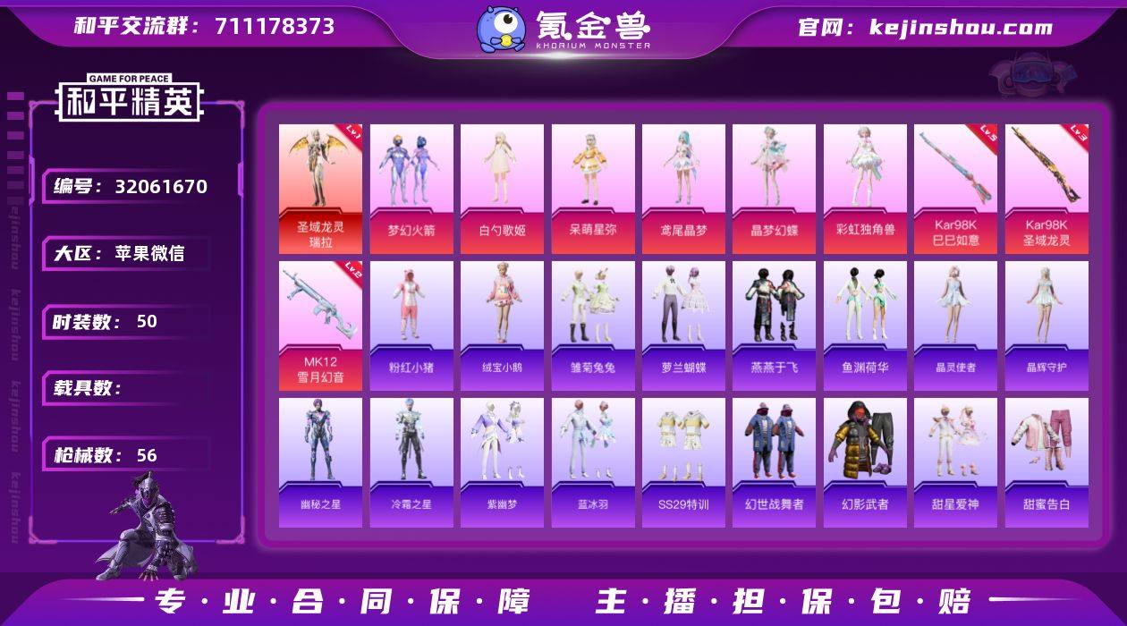 TY708-精品公主号-可二次-【二字ID】【一级神装瑞拉】【梦幻火箭,白勺歌姬,呆萌星弥,鸢尾晶梦,晶梦幻蝶,彩虹独角兽,粉红小猪】苹果 微信-1神装-6粉装-3特效枪-0载具-2粉色飞行器-19341热力值-3王牌印记-50套装-56枪皮 【红色神装等级】:圣域龙灵-瑞拉(一级) 【红色角色神装】:圣域龙灵-瑞拉 【热门品类】:粉装-梦幻火箭,套装-粉红小猪 【粉色套装】:粉装-梦幻火箭,角色-白勺歌姬,角色-呆萌星弥,角色-鸢尾晶梦,角色-晶梦幻蝶,角色-彩虹独角兽 【粉色枪皮等级】:汤姆逊-星月云朵(二级MK12-雪月幻音),Kar98K-巳巳如意(五级),Kar98K-圣域龙灵(三级) 【粉色枪皮】:Kar98K-巳巳如意,Kar98K-圣域龙灵,MK12-雪月幻音 【粉色飞行器】:彩虹独角兽飞行器,圣域金龙飞行器 【粉色降落伞】:梦幻火箭降落伞,白勺歌姬降落伞,蜜语绒猫降落伞,晶梦幻蝶降落伞,彩虹独角兽降落伞,圣域龙灵降落伞 【稀有套装】:套装-绒宝小鹅,套装-雏菊兔兔,套装-萝兰蝴蝶,套装-燕燕于飞,套装-鱼渊荷华,套装-晶灵使者,套装-晶辉守护,角色-幽秘之星,角色-冷霜之星,套装-紫幽梦,套装-蓝冰羽 【稀有枪皮】:AKM-破晓战魂,SCAR-L-炫彩节奏,SCAR-L-玉兔迎春,M416-蓝色火焰,M416-萌萌史莱姆,AUG-耀粉歌者,QBZ-彩虹符号,QBZ-绒兔团圆,M762-天降萌叽,AC-VAL-天降萌叽,ACE32-蓝晶绮麟,UZI-天降萌叽,Vector-生命誓言,AKS-74U-鬼刀,M24-蓝晶绮麟,SKS-圣域龙灵,Mini14-梦幻火箭,Win94-晶梦幻蝶,M417-圣辉之星,MK20-H-圣域龙灵,S686-白勺歌姬,S12K-破晓战魂,DBS-月下星之子,DP-28-彩虹独角兽,MG3-幻世战舞者,短管霰弹-圣域龙灵 【其他套装】:套装-SS29特训,套装-幻世战舞者,套装-幻影武者,套装-甜星爱神,套装-甜蜜告白,套装-破晓战魂,套装-破蛋小黄鸡,套装-竞技名士,套装-粉红小猪,套装...