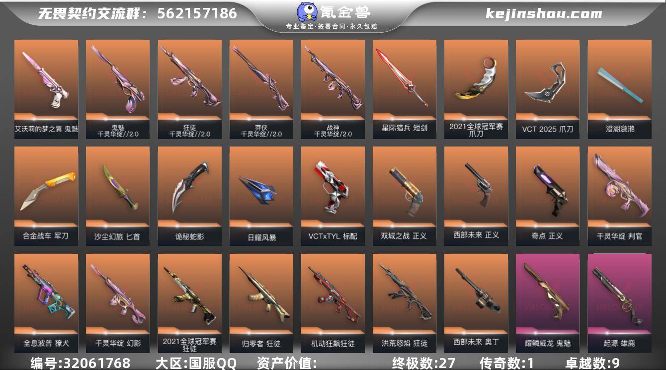 【3726】【套装】:2021全球冠军赛套装,千灵华绽//2.0套装,VCT 2025 赛季套装,《英雄联盟:双城之战》套装,耀鳞威龙套装,无畏启程套装 【英雄】:幻棱,炼狱,维斯,暮蝶,钛狐,壹决,铁臂,捷风,雷兹,幽影,不死鸟,贤者,猎枭,蝰蛇,零,芮娜,奇乐,尚勃勒,霓虹,斯凯,夜露,星礈,K/O,海神,盖可,黑梦,钢锁 【近战武器】:近战武器-2021全球冠军赛 爪刀,近战武器-碎心裂刃,近战武器-流风回雪,近战武器-VCT 2025 爪刀,近战武器-威龙之刃,近战武器-澄湖潋滟,近战武器-合金战车 军刀,近战武器-沙尘幻旅 匕首,近战武器-诡秘蛇影 军刀,近战武器-日耀风暴 遗器,近战武器-星际猎兵 短剑 【狂徒】:狂徒-2021全球冠军赛,狂徒-归零者,狂徒-洪荒怒焰,狂徒-机动狂飙,狂徒-千灵华绽//2.0,狂徒-掠影,狂徒-盖亚的复仇,狂徒-耀鳞威龙,狂徒-紫阙金琅,狂徒-沙尘幻旅,狂徒-诡秘蛇影 【幻影】:幻影-千灵华绽,幻影-侦察力量,幻影-合金战车,幻影-神圣领域,幻影-末日之翼 【戍卫】:戍卫-紫阙金琅,戍卫-花漾粉红,戍卫-萌彩剪影,戍卫-沙场老兵,戍卫-月球哨兵,戍卫-折光棱晶 【獠犬】:獠犬-全息波普,獠犬-神圣领域,獠犬-胡桃狂想,獠犬-数码咒术 【冥驹】:冥驹-离子武器,冥驹-胡桃狂想,冥驹-花漾粉红 【飞将】:飞将-合金战车,飞将-沙尘幻旅,飞将-末日之翼 【莽侠】:莽侠-千灵华绽//2.0,莽侠-诡秘蛇影,莽侠-月球哨兵 【战神】:战神-千灵华绽//2.0,战神-神圣领域,战神-萌彩剪影,战神-沙场老兵,战神-数码咒术 【奥丁】:奥丁-西部未来,奥丁-末日之翼 【判官】:判官-千灵华绽,判官-诡秘蛇影,判官-萌彩剪影,判官-数码咒术 【雄鹿】:雄鹿-起源,雄鹿-月球哨兵 【骇灵】:骇灵-沙尘幻旅,骇灵-无限竞技,骇灵-花漾粉红,骇灵-星云暗涌 【蜂刺】:蜂刺-合金战车,蜂刺-胡...