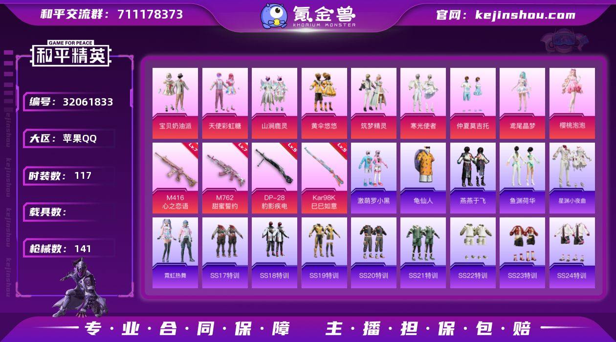 苹果 手Q-9粉装-4特效枪-0载具-3粉色飞行器-50067热力值-18王牌印记-117套装-141枪皮 【热门品类】:套装-龟仙人 【粉色套装】:粉装-宝贝奶油派,粉装-天使彩虹糖,粉装-山涧鹿灵,粉装-黄伞悠悠,粉装-筑梦精灵,粉装-寒光使者,粉装-仲夏莫吉托,角色-鸢尾晶梦,角色-樱桃泡泡 【粉色枪皮等级】:M416-心之恋语(七级),M762-甜蜜誓约(七级),Kar98K-巳巳如意(五级),DP-28-豹影疾电(五级) 【粉色枪皮】:M416-心之恋语,M762-甜蜜誓约,Kar98K-巳巳如意,DP-28-豹影疾电 【粉色飞行器】:炫彩糖果飞行器,天之羽翼飞行器,苔丝玫瑰飞行器 【粉色降落伞】:百万伏特降落伞,甜心宝贝降落伞,神秘黑猫降落伞,甜蜜誓约降落伞,蓝莓炮弹降落伞,碧影闪光降落伞,筑梦精灵降落伞,旋转彩虹降落伞,暗夜鎏金降落伞,苔丝玫瑰降落伞,鬼刀降落伞,幻彩电音降落伞,异瞳寒姬降落伞,炫彩糖果降落伞 【稀有套装】:套装-龟仙人,套装-雪国风尚,套装-炫彩糖果,套装-燕燕于飞,套装-鱼渊荷华,套装-星渊小夜曲,套装-霓虹热舞 【稀有枪皮】:AKM-彩虹符号,AKM-破晓战魂,AKM-龙的传人,M16A4-幻世战舞者,M16A4-甜心亚梦,SCAR-L-玉兔迎春,SCAR-L-甜蜜誓约,SCAR-L-红色方程式,M416-糯团青竹,M416-红色方程式,M416-绯红前夜,M416-蓝色火焰,GROZA-异彩先驱,GROZA-春暖花开,GROZA-林间仙鹿,GROZA-田园牧歌,AUG-灵符少年,AUG-耀粉歌者,QBZ-彩虹符号,QBZ-飞驰魅影,M762-天降萌叽,M762-瑞龙福将,G36C-暗夜玫瑰,AC-VAL-天降萌叽,AC-VAL-甜心亚梦,蜜獾-天降萌叽,蜜獾-娇憨猪猪,UZI-天降萌叽,UZI-娇憨猪猪,UZI-炫彩节奏,UZI-红色方程式,UMP45-春暖花开,UMP45-海渊国主,UMP45-涂山之恋,UMP45-生命誓言,UMP45-蓝色火焰,Vector-焰鹰斗篷,Vector-暗夜玫瑰,Vector-生命誓言,Vector-田园牧歌,汤姆...