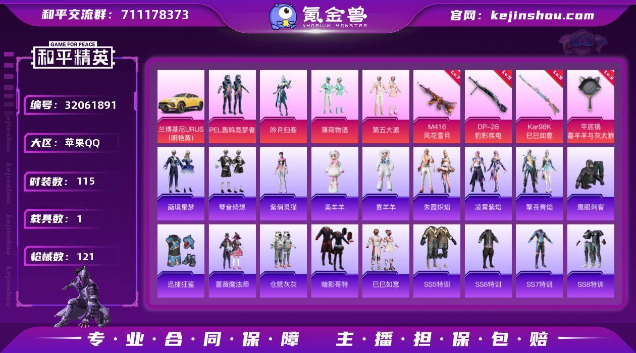 苹果 手Q-4粉装-4特效枪-1载具-2粉色飞行器-43049热力值-3王牌印记-115套装-121枪皮 【热门品类】:套装-暗影哥特 【粉色套装】:粉装-PEL轰鸣竞梦者,粉装-吟月归客,粉装-薄荷物语,粉装-第五大道 【粉色枪皮等级】:M416-风花雪月(七级),Kar98K-巳巳如意(五级),DP-28-豹影疾电(五级),平底锅-喜羊羊与灰太狼(三级) 【粉色载具】:兰博基尼URUS(明艳黄) 【粉色枪皮】:M416-风花雪月,Kar98K-巳巳如意,DP-28-豹影疾电,平底锅-喜羊羊与灰太狼 【粉色飞行器】:炫彩糖果飞行器,心之恋语飞行翼 【粉色降落伞】:百万伏特降落伞,银河战甲降落伞,神秘黑猫降落伞,四圣焕新降落伞,银刃赛罗降落伞,喜羊羊与灰太狼降落伞,异瞳寒姬降落伞,炫彩糖果降落伞 【稀有套装】:套装-巳巳如意,套装-雪国风尚,套装-炫彩糖果,套装-朱霞炽焰,套装-凌霄紫焰,套装-擎苍青焰,玩偶服-美羊羊,玩偶服-喜羊羊,角色-紫俏灵猫,套装-画境星梦,套装-琴音绮想 【稀有枪皮】:AKM-彩虹符号,AKM-影袭,AKM-生命誓言,AKM-萌趣颜团子,AKM-虎虎生威,M16A4-凝视深渊,M16A4-红色方程式,M16A4-魔法学院,SCAR-L-红色方程式,M416-夜灯,M416-红色方程式,GROZA-影袭,GROZA-黑色刀锋,QBZ-彩虹符号,QBZ-银河战甲,M762-拳皇97,M762-牛气冲天,M762-瑞龙福将,M762-绯红前夜,G36C-荒野猎神,AC-VAL-天降萌叽,ACE32-画境星梦,ARX-凌霄紫焰,UZI-影袭,UZI-炫彩节奏,UMP45-春暖花开,UMP45-生命誓言,Vector-彩虹符号,汤姆逊-天降萌叽,MP5K-画境星梦,JS9-凌霄紫焰,P90-巳巳如意,Kar98K-影袭,Kar98K-深海曼妙,M24-影袭,M24-冰封烈焰,SKS-夜灯,VSS-荒野猎神,Mini14-春暖花开,Mini14-炫彩节奏,Mini14-生命誓言,Win94-瑞龙福将,AMR-喜羊羊与灰太狼,M1加兰德-画境星梦,S686-冰封烈焰,S686-生命誓言,S12K-...