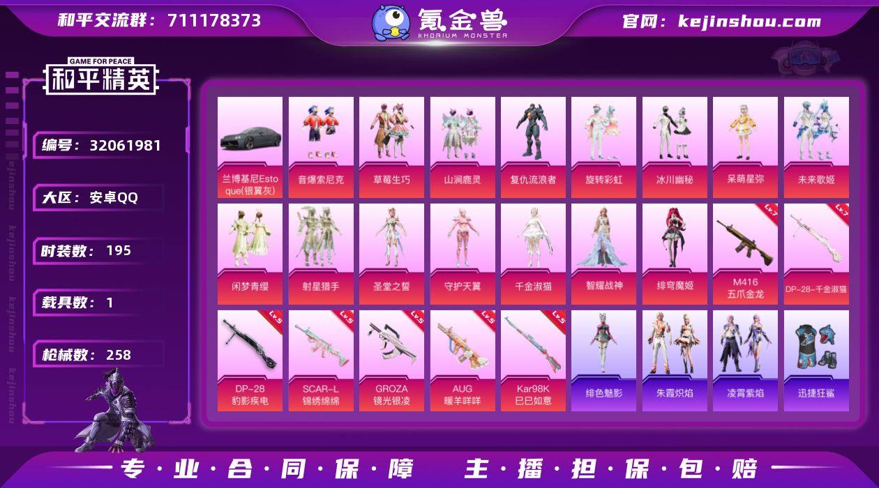 安卓 手Q-15粉装-7特效枪-1载具-3粉色飞行器-89660热力值-18王牌印记-195套装-258枪皮 【热门品类】:粉装-音爆索尼克,角色-军刀雅典娜,套装-星河浪客,套装-龟仙人,套装-粉红小猪 【粉色套装】:粉装-草莓生巧,粉装-山涧鹿灵,角色-复仇流浪者,粉装-旋转彩虹,粉装-冰川幽秘,粉装-音爆索尼克,角色-呆萌星弥,粉装-未来歌姬,粉装-闲梦青缨,粉装-射星猎手,角色-圣堂之誓,角色-守护天翼,角色-千金淑猫,角色-智耀战神,角色-绯穹魔姬 【粉色枪皮等级】:SCAR-L-锦绣绵绵(五级),M416-五爪金龙(七级),GROZA-镜光银凌(五级),AUG-暖羊咩咩(五级),Kar98K-巳巳如意(五级),DP-28-千金淑猫(七级),DP-28-豹影疾电(五级) 【粉色载具】:兰博基尼Estoque(银翼灰) 【粉色枪皮】:SCAR-L-锦绣绵绵,M416-五爪金龙,GROZA-镜光银凌,AUG-暖羊咩咩,Kar98K-巳巳如意,DP-28-千金淑猫,DP-28-豹影疾电 【粉色飞行器】:春暖花开飞行器,暗翼战神飞行器,凤舞九天飞行器 【粉色降落伞】:春暖花开降落伞,梦幻火箭降落伞,青春物语降落伞,垂柳戏鸭降落伞,旋转彩虹降落伞,仲夏莫吉托降落伞,飒粉甜心降落伞,白勺歌姬降落伞,未来歌姬降落伞,闲梦青缨降落伞,超新星降落伞,莲影清波降落伞,圣堂之誓降落伞,精灵梦叶罗丽降落伞,金丰海韵降落伞,千金淑猫降落伞,临安公主降落伞,樱桃泡泡降落伞,星穹咏叹调降落伞,幻彩电音降落伞,冷漠罗丽降落伞,荧海星豚降落伞,异瞳寒姬降落伞,霁蓝缠春降落伞 【稀有套装】:套装-龟仙人,套装-巳巳如意,套装-雏菊兔兔,套装-萝兰蝴蝶,套装-糖糖葫芦,套装-青团波波,套装-棉花软糖,角色-都市丽猫,角色-摩登魅猫,角色-许七安,角色-临安公主,套装-燕燕于飞,套装-鱼渊荷华,角色-糖霜甜心,套装-紫幽梦,套装-蓝冰羽,套装-星影赞美诗,套装-星渊小夜曲,套装-...