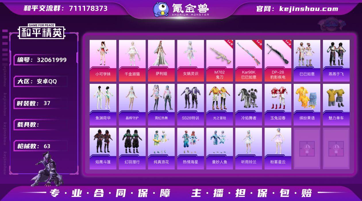 【ky66】安卓 手Q-3粉装-6特效枪-0载具-1粉色飞行器-46500热力值-14王牌印记-129套装-161枪皮 【热门品类】:套装-龟仙人 【粉色套装】:粉装-齐天大圣,粉装-未来领航者,角色-异瞳寒姬 【粉色枪皮等级】:M416-电玩时刻(五级),GROZA-镜光银凌(五级),UMP45-量子极限(五级),Kar98K-巳巳如意(五级),DP-28-千金淑猫(七级),DP-28-豹影疾电(五级) 【粉色枪皮】:M416-电玩时刻,GROZA-镜光银凌,UMP45-量子极限,Kar98K-巳巳如意,DP-28-千金淑猫,DP-28-豹影疾电 【粉色降落伞】:星夜魔法师降落伞,仲夏莫吉托降落伞,千金淑猫降落伞,脆鲨七海降落伞,喜羊羊与灰太狼降落伞,炫彩糖果降落伞 【稀有套装】:套装-龟仙人,套装-巳巳如意,套装-炫彩糖果,套装-雏菊兔兔,套装-萝兰蝴蝶,套装-糖糖葫芦,套装-青团波波,套装-棉花软糖,角色-摩登魅猫,套装-燕燕于飞,套装-鱼渊荷华,套装-霓虹热舞,角色-紫俏灵猫 【稀有枪皮】:AUG-冰晶雪宝,AKM-灼热熔岩,AKM-破晓战魂,AKM-萌趣颜团子,AKM-霓虹街区,AKM-龙的传人,M16A4-幻世战舞者,M16A4-红色方程式,M16A4-蓝色火焰,M16A4-千金淑猫,SCAR-L-炫彩节奏,SCAR-L-玉兔迎春,SCAR-L-红色方程式,M416-糯团青竹,M416-红色方程式,M416-蓝色火焰,AUG-天降萌叽,AUG-耀粉歌者,QBZ-彩虹符号,QBZ-洛神天依,QBZ-银碳小老虎,M762-天降萌叽,Mk47-妙红点点,Mk47-洛神天依,AC-VAL-天降萌叽,AC-VAL-快闪甜心,AC-VAL-闲梦青缨,蜜獾-天降萌叽,蜜獾-娇憨猪猪,UZI-啾咪啾咪,UZI-天降萌叽,UZI-娇憨猪猪,UZI-炫彩节奏,UZI-红色方程式,UMP45-生命誓言,UMP45-蓝色火焰,UMP45-绒宝小鹅,UMP45-极意拳锋,Vector-彩虹符号,Vector-生命誓言,汤姆逊-天降萌叽,汤姆逊-幻影战神,汤姆逊-耀粉歌者,P90-快闪甜心,P90-飞驰魅影,P90-巳巳如意,Kar98K-彩虹...