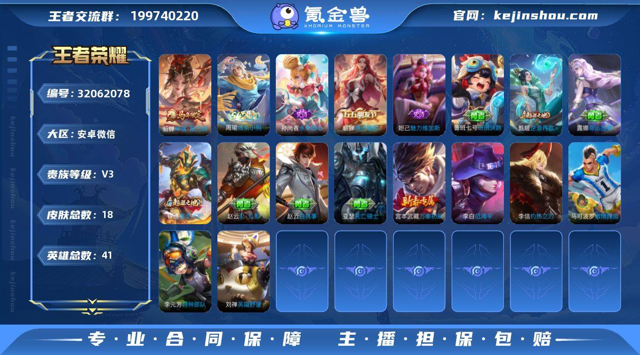 安卓微信404区18皮0典藏1传说0无双V3 营地ID1613240484尊贵铂金III【传说皮肤】:神骥·聚万邦【史诗皮肤】:水果甜心,魅力维加斯,唤灵魅影 1613240484