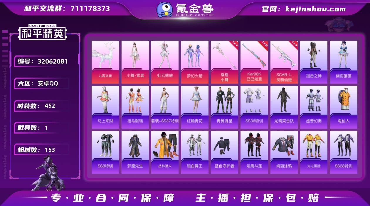 实名:可二次实名 是否支持人脸包赔:支持 粉装数量:3 特效枪数量:3 载具数:1 时装数:452 枪械数:153 小舞·雪昙,虹云熊熊,梦幻火箭 七级撬棍-小舞,五级Kar98K-巳巳如意,三级SCAR-L-灵驹仙姬 九霄玄鹿 狙击之神,马上来财,幽雨猫猫,福马献瑞,红釉青花,SS37特训,雨过天青,青翼流星,SS36特训,暗夜行者,缤纷果语,北国孤狼,冰公主,白色伏地魔,长空猛禽,丛林猎人,传奇侦探,炽焰拳师,疯狂小兔子,飞行日记,格斗专家,龟仙人,光之冒险,贵族骑装,灰色格斗者,黄色运动,浑天鲲鹏,幻羽潜行,酒红色名流,娇憨猪猪,竞技名士,竞技勇士朋克,坚韧舞者,金鼠迎春,街头潮人,军械专家,金耀舞者,酷潮明星,龙魂突击队,镭射皇者,蓝色守护者,蓝色运动,冷焰舞者,萌黄之夏,魅力单车,麻辣教官,萌趣咩咩,迷域探索者,梦魇先生,霓虹街区,牛气冲天,牛气满满,破蛋小黄鸡,轻风白浪,拳皇97草薙京,奇迹天团,绮丽涂鸦,青涩时光,圣诞大吉,圣诞惊喜,深蓝冒险家,SS10特训,SS12特训,SS13特训,SS14特训,SS20特训,SS21特训,SS22特训,SS23特训,SS24特训,SS27特训,SS28特训,SS2特训,SS30特训套装,SS31特训套装,SS32特训套装,SS3特训,SS5特训,SS6特训,SS7特训,SS8特训,SS9特训,巳巳如意,探宝勇士,甜蜜告白,甜蜜熊情侣,特训学院,甜心亚梦,田园牧歌,童真绒兔,完美偶像,夏日音浪,雪山精英,虚音幻奏,银白舞王,跃动心情,耀粉歌者,玉兔迎春,焰鹰斗篷,鱼渊荷华,幽夜迷踪,夜莺强袭者,耀眼新星,燕燕于飞,战地菁英,智慧之神,装甲骑士 云梦轻舟飞行器,梦幻火箭飞行器,虹云熊熊降落伞,灵驹仙姬降落伞,阿狸红降落伞,环太平洋降落伞,梦幻火箭降落伞,旋转彩虹降落伞 卖家说:连体王者V8