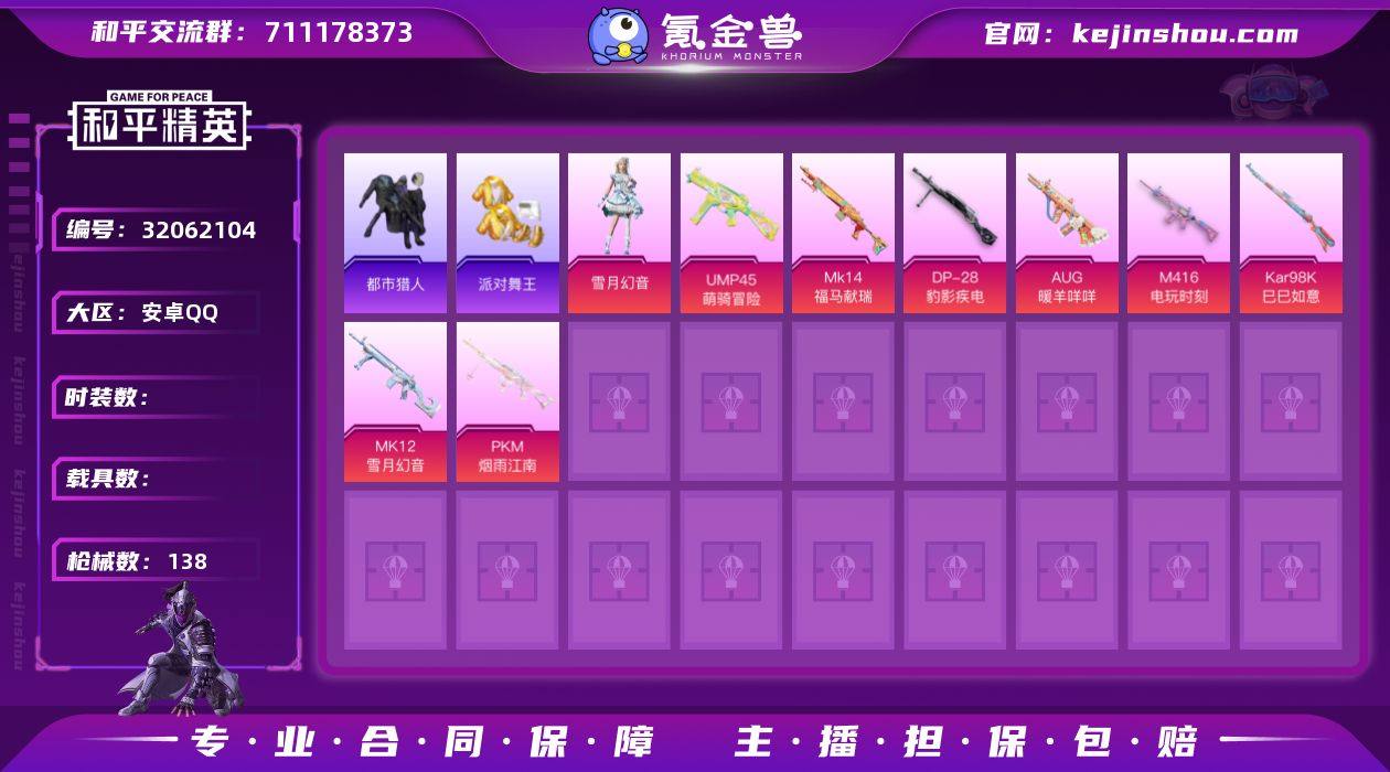 【0载具 8特效枪 1粉装 138枪皮 113套装】11印记/4.2万热力值/52级收藏家/有小丑鱼,蓝螳螂,小金鞋,鲨鱼裤/套装-都市猎人,套装-浪漫天命,套装-派对舞王,套装-小丑鱼,套装-老实芭蕉,角色-Mark.06,套装-雪月幻音/8升级枪:AUG-暖羊咩咩,M416-电玩时刻,Kar98K-巳巳如意,Mk14-福马献瑞,MK12-雪月幻音,UMP45-萌骑冒险,PKM-江南烟雨,DP-28-豹影疾电/6飞行器:炫彩糖果飞行器,登顶巅峰飞行器,鸡智如我飞行器,马上有福飞行器,异域银装飞行器,狂鲨锋刃飞行器153927438x,编号:LYCVN61