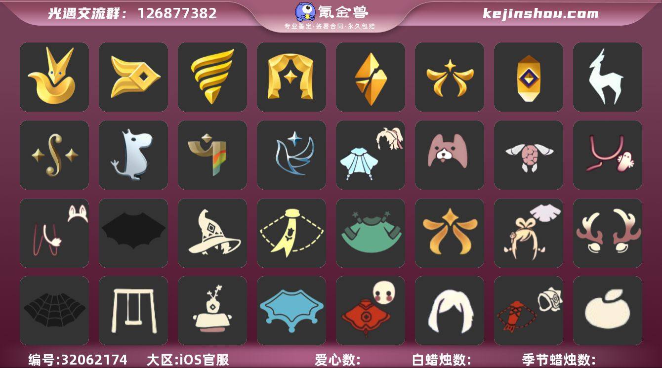 账号类型: 手机账号 季节已毕业: 小王子季,风行季,潜海季,表演季,破晓季,欧若拉季,追忆季,九色鹿季,二重奏季,姆明季,彩染季,青鸟季 完成地图: 晨岛,云野,雨林,霞谷,暮土,禁阁,全图毕业 珍稀物品: 白枭,透明蝶翼斗,玫瑰花 礼包: 蝙蝠套,巫师,围巾,星球斗,欧若拉之翼,绊爱,鹿角,蜘蛛斗,秋千,茶桌,瑞雪,福娃,奔跑发型,鲤鱼套,橘子,贝壳,黄伞,红伞,兔子,南瓜,枯角,雪花,tgc,水母,星月头饰,彩虹耳钉,四叶草,雪人鞋,创始人,海蓝波浪发型,线框斗,姆明饰品套装,树精肩饰,海龟斗篷,小狗周年发饰,青衫落拓礼包 裤子: 武士裤,背带裤,白棉裤,搓澡巾 面具: 黄鼠狼,红狐狸 面饰: 红耳机 项链: 围巾 发型: 蝴蝶结,正太,樱花,公主头,虚荣,猫耳,白枭 头饰: 花环 斗篷: 白金,红金,白鸟斗,花瓣斗篷,荧蓝斗篷 配饰: 雨伞,高音钢琴,吉他,笛子,大铃铛乐器,乐器