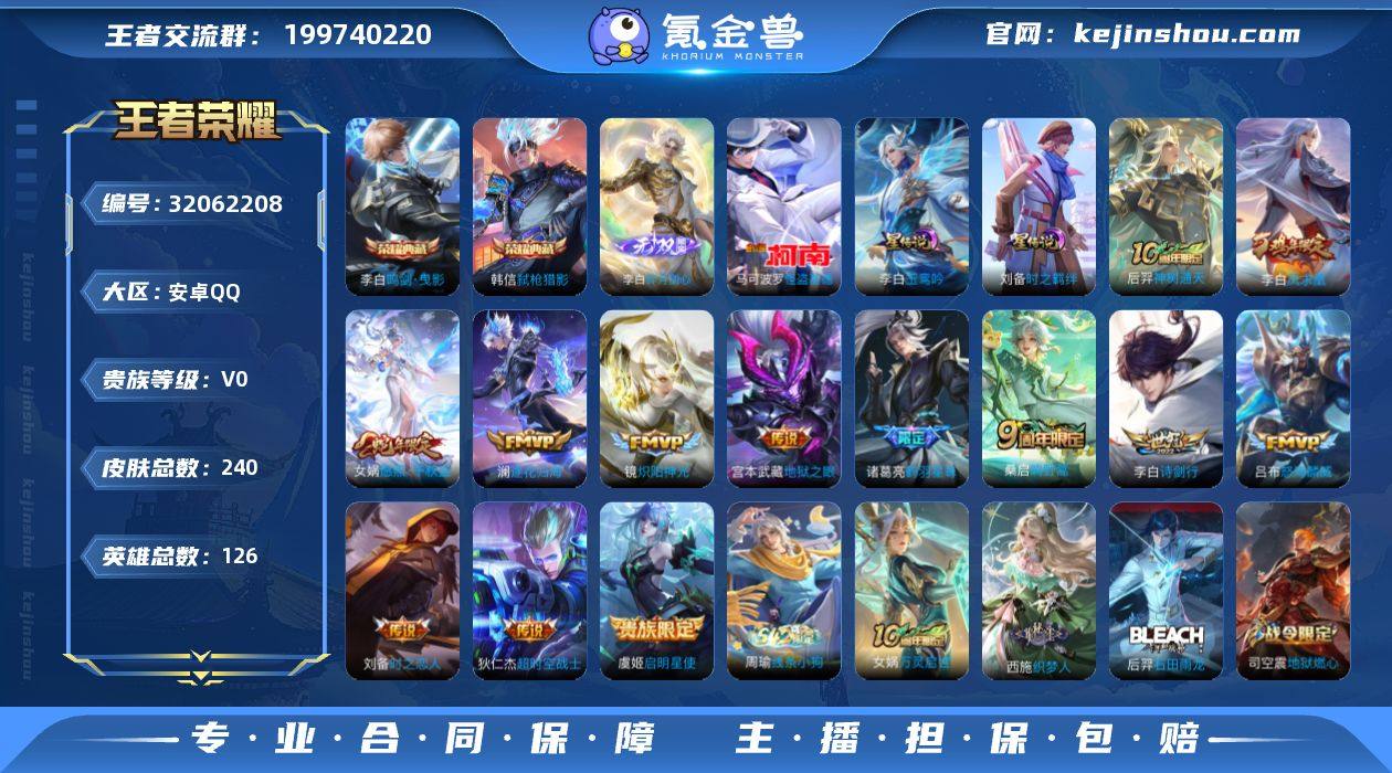 贵族等级:V0 典藏皮肤数:2 珍品无双皮肤数:0 无双皮肤数:1 珍品传说皮肤数:1 传说皮肤数:13 史诗皮肤数:61 皮肤数:240 英雄数:126 段位:钻石 卖家说:李白全皮肤