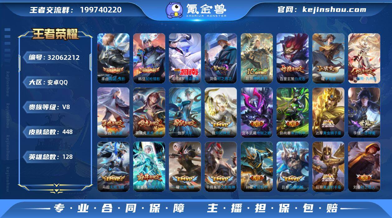 贵族等级:V8 典藏皮肤数:2 珍品无双皮肤数:0 无双皮肤数:0 珍品传说皮肤数:1 传说皮肤数:28 史诗皮肤数:141 皮肤数:448 英雄数:128 段位:非凡王者 卖家说:万战韩信打野号还有很多限定皮肤