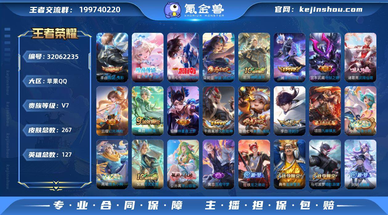 苹果Q-267皮肤-1典藏皮肤-2珍品传说-11传说-71史诗 【英雄全皮】:孙权全皮 【荣耀典藏】:李白鸣剑曳影 【珍品传说】:瑶大耳狗之梦,鲁班七号江户川柯南 【传说皮肤】:朵莉亚神骥鸣幻洲,后羿神树通天,云缨幻光神枪,桑启鸣野蒿,澜逐花归海,李白诗剑行,鲁班七号寅虎瑞焰,干将莫邪久胜战神,诸葛亮武陵仙君,貂蝉仲夏夜之梦,宫本武藏地狱之眼 【限定皮肤】:白起狰,李白谪仙醉月,狄仁杰阴阳师,虞姬凯尔特女王,赵云皇家上将,嬴政白昼王子,孙尚香蔷薇恋人,鲁班七号狮舞东方,鲁班七号寅虎瑞焰,庄周高山流水,孙膑妖精王,扁鹊炼金王,芈月重明,芈月幻夜卜梦,吕布猎兽之王,夏侯惇朔风刀,甄姬游园惊梦,曹操烛龙,典韦穷奇,典韦蓝屏警告,马可波罗逐梦之星,马可波罗暗影游猎,狄仁杰魔术师,狄仁杰万华元夜,达摩沙漠行僧,项羽海滩派对,老夫子醍醐杖,程咬金演武夺筹,兰陵王金庭之子,牛魔御旌,后羿辉光之辰,李元芳云中旅人,钟馗神迹守卫,杨玉环遇见飞天,女娲朔望之晖,干将莫邪胡桃夹子,雅典娜黎明之约,蔡文姬繁星吟游,太乙真人饕餮,鬼谷子原初探秘者,鬼谷子五谷丰年,诸葛亮武陵仙君,黄忠火炮绅士,苏烈千军破阵,百里玄策原初追逐者,弈星混沌棋,梦奇顽趣,沈梦溪大漠名商,明世隐疑决卦,裴擒虎李小龙,裴擒虎擒涛扼浪,狂铁御狮,米莱狄御霄,云中君纤云弄巧,盾山御銮,猪八戒西部大镖客,上官婉儿梁祝,鲁班大师探海日志,桑启海盐诗旅,阿古朵江河有灵,张良古海寻踪,蒙犽百解令,蒙恬荣光圣徽,鬼谷子天穹祈灯,姬小满妄想食味,沈梦溪龙舞盛年,刘邦剑破天穹,上官婉儿群星魔术团,程咬金群星魔术团 【年限皮肤】:后羿辉光之辰,鲁班七号寅虎瑞焰 【赛季限定】:孙膑妖精王,扁鹊炼金王,虞姬凯尔特女王,白起狰,太乙真人饕餮,曹操烛龙,芈月重明,典韦穷奇,狂铁...
