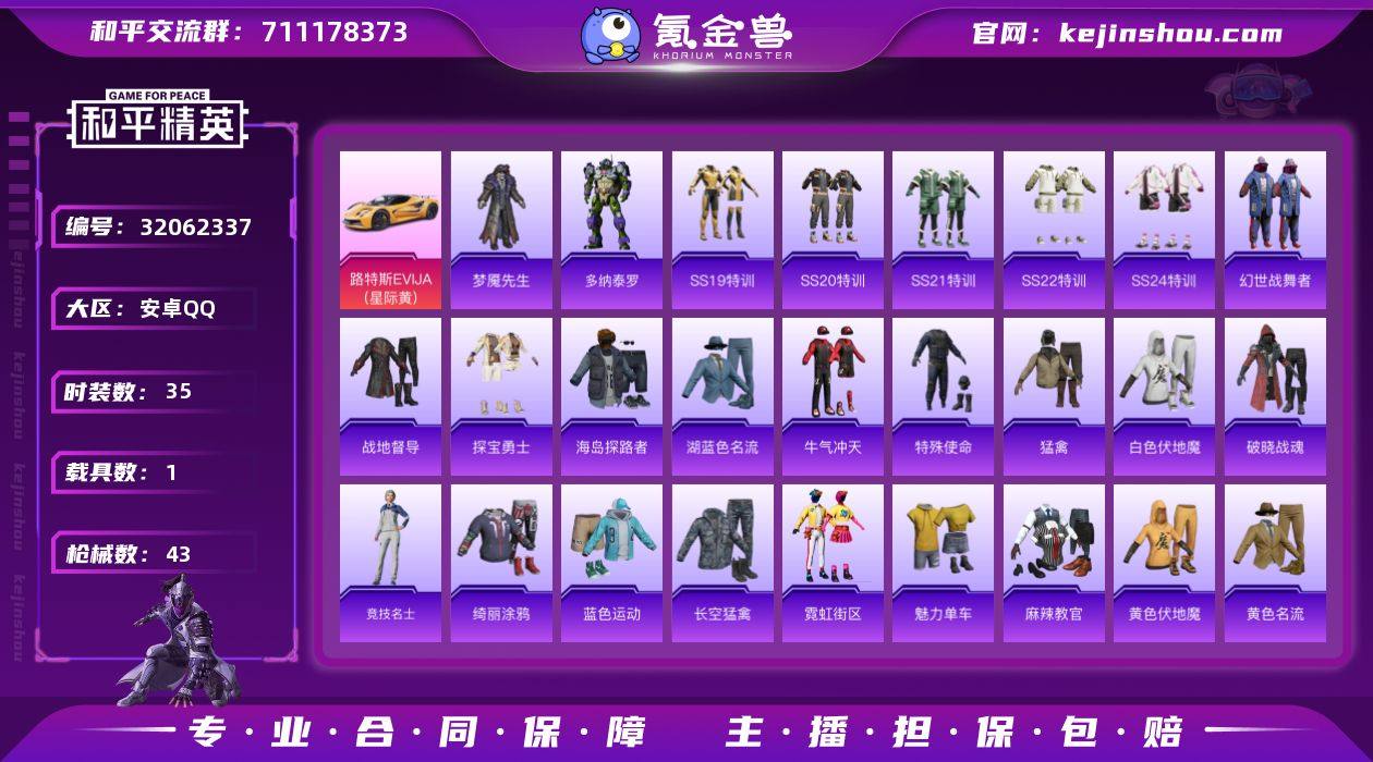 安卓 手Q-0粉装-0特效枪-1载具-0粉色飞行器-13325热力值-1王牌印记-35套装-43枪皮 【粉色载具】:路特斯EVIJA(星际黄) 【粉色降落伞】:垂柳戏鸭降落伞 【稀有套装】:角色-多纳泰罗 【稀有枪皮】:AKM-灼热熔岩,AKM-破晓战魂,M16A4-幻世战舞者,SCAR-L-玉兔迎春,SCAR-L-红色方程式,M416-糯团青竹,M416-红色方程式,GROZA-异彩先驱,GROZA-彩虹符号,AUG-耀粉歌者,QBZ-彩虹符号,AC-VAL-天降萌叽,蜜獾-娇憨猪猪,UZI-天降萌叽,UZI-娇憨猪猪,Vector-生命誓言,汤姆逊-异彩先驱,MP5K-异彩先驱,Kar98K-红色方程式,AWM-垂柳戏鸭,SKS-未来歌姬,Mini14-异彩先驱,SLR-娇憨猪猪,S686-红色方程式,S1897-炫彩节奏,S12K-破晓战魂,S12K-娇憨猪猪,S12K-幻世战舞者,M249-破晓战魂,MG3-幻世战舞者 【其他套装】:套装-SS19特训,套装-SS20特训,套装-SS21特训,套装-SS22特训,套装-SS24特训,套装-幻世战舞者,套装-战地督导,套装-探宝勇士,套装-海岛探路者,套装-湖蓝色名流,套装-牛气冲天,套装-特殊使命,套装-猛禽,套装-白色伏地魔,套装-破晓战魂,套装-竞技名士,套装-绮丽涂鸦,套装-蓝色运动,套装-长空猛禽,套装-霓虹街区,套装-魅力单车,套装-麻辣教官,套装-黄色伏地魔,套装-黄色名流,套装-黑色伏地魔,套装-金耀舞者,套装-冰川特警,套装-梦魇先生,套装-异彩先驱,套装-霓虹极客,套装-娇憨猪猪,套装-萌趣咩咩 【营地ID】:913798583