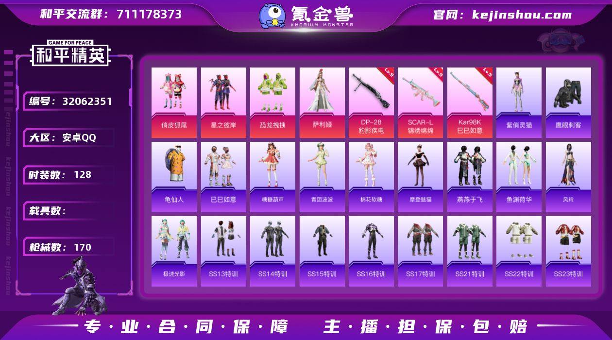 安卓 手Q-4粉装-4特效枪-0载具-1粉色飞行器-47509热力值-2王牌印记-128套装-170枪皮 【热门品类】:套装-龟仙人 【粉色套装】:粉装-俏皮狐尾,粉装-星之彼岸,粉装-恐龙拽拽,角色-萨利娅 【粉色枪皮等级】:SCAR-L-锦绣绵绵(五级),Kar98K-巳巳如意(五级),DP-28-豹影疾电(五级) 【粉色枪皮】:SCAR-L-锦绣绵绵,Kar98K-巳巳如意,Mk14-福马献瑞,DP-28-豹影疾电 【粉色飞行器】:花傲天飞行器 【粉色降落伞】:童趣迷兔降落伞,葫芦兄弟降落伞,恐龙拽拽降落伞,萌酷奶龙降落伞,繁龙极客降落伞,时空协奏降落伞 【稀有套装】:套装-龟仙人,套装-巳巳如意,套装-糖糖葫芦,套装-青团波波,套装-棉花软糖,角色-摩登魅猫,套装-燕燕于飞,套装-鱼渊荷华,角色-风玲,套装-极速光影,角色-紫俏灵猫,角色-曹焱兵 【稀有枪皮】:AKM-恐龙拽拽,AKM-破晓战魂,AKM-虎虎生威,AKM-霓虹街区,AKM-龙的传人,M16A4-幻世战舞者,M16A4-红色方程式,M16A4-蓝色火焰,SCAR-L-夜灯,SCAR-L-玉兔迎春,SCAR-L-红色方程式,M416-快乐主宰,M416-糯团青竹,M416-红色方程式,M416-蓝色火焰,GROZA-异彩先驱,GROZA-彩虹符号,GROZA-影袭,GROZA-恐龙拽拽,AUG-耀粉歌者,AUG-月影灵韵,QBZ-彩虹符号,M762-天降萌叽,Mk47-洛神天依,AC-VAL-天降萌叽,AC-VAL-快闪甜心,蜜獾-天降萌叽,UZI-啾咪啾咪,UZI-天降萌叽,UZI-炫彩节奏,UZI-红色方程式,UMP45-夜灯,UMP45-蓝色火焰,UMP45-绒宝小鹅,Vector-焰鹰斗篷,Vector-生命誓言,汤姆逊-天降萌叽,汤姆逊-耀粉歌者,AKS-74U-鬼刀,P90-快闪甜心,P90-巳巳如意,Kar98K-彩虹符号,Kar98K-王子的夏天,Kar98K-红色方程式,AWM-焰鹰斗篷,AWM-恐龙拽拽,SKS-心之恋语,SKS-未来歌姬,SKS-炫彩节奏,SKS-糯团青竹,VSS-彩虹符号,VSS-星之彼岸,Mini14-穿刺龙虾,Mini14-耀粉...