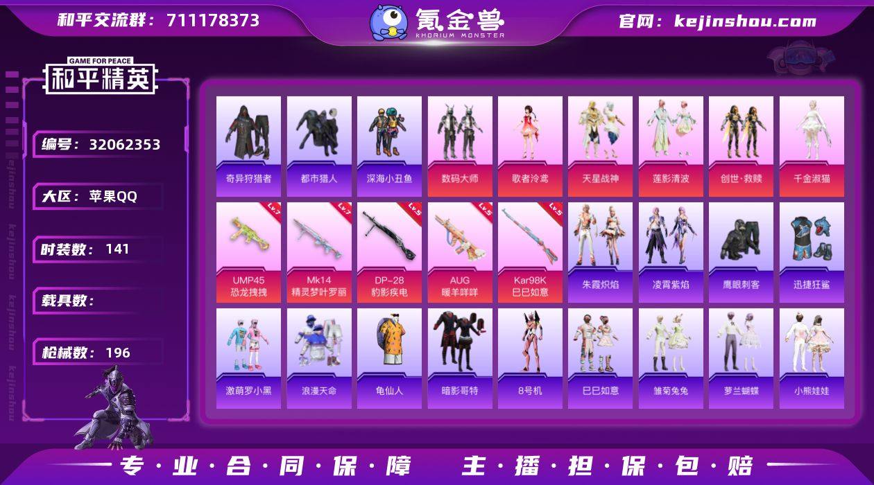 苹果 手Q-6粉装-5特效枪-0载具-5粉色飞行器-59800热力值-6王牌印记-141套装-196枪皮 【热门品类】:套装-浪漫天命,套装-都市猎人,套装-深海小丑鱼,套装-奇异狩猎者,套装-龟仙人,套装-暗影哥特,角色-8号机 【粉色套装】:粉装-数码大师,角色-歌者泠鸢,粉装-天星战神,粉装-莲影清波,套装-创世·救赎,角色-千金淑猫 【粉色枪皮等级】:AUG-暖羊咩咩(五级),UMP45-恐龙拽拽(七级),Kar98K-巳巳如意(五级),Mk14-精灵梦叶罗丽(七级),DP-28-豹影疾电(五级) 【粉色枪皮】:AUG-暖羊咩咩,UMP45-恐龙拽拽,Kar98K-巳巳如意,Mk14-精灵梦叶罗丽,DP-28-豹影疾电 【粉色飞行器】:天之羽翼飞行器,祥瑞锦鲤飞行器,星空武士飞行器,幻星舰长飞行器 【粉色降落伞】:极限特训降落伞,未来战士降落伞,星之彼岸降落伞,怪笑疯兔降落伞,青空秋雨降落伞,暗夜鎏金降落伞,第五大道降落伞,飒粉甜心降落伞,莲影清波降落伞,创世·救赎降落伞,千金淑猫降落伞,幻彩电音降落伞,冷漠罗丽降落伞,绯穹魔姬降落伞 【稀有套装】:套装-龟仙人,套装-巳巳如意,套装-雏菊兔兔,套装-萝兰蝴蝶,套装-小熊娃娃,角色-都市丽猫,角色-临安公主,套装-燕燕于飞,套装-鱼渊荷华,套装-云朵鹅,套装-雪绒豹,角色-灵公主,套装-朱霞炽焰,套装-凌霄紫焰 【稀有枪皮】:AKM-奇异狩猎者,AKM-彩虹符号,AKM-影袭,AKM-星之彼岸,AKM-破晓战魂,AKM-缤纷海域,AKM-霓虹街区,M16A4-生命誓言,M16A4-蓝色火焰,SCAR-L-生命誓言,SCAR-L-红色方程式,SCAR-L-黄金龙骨,M416-彩虹嘻嘻猴,M416-糯团青竹,M416-蓝色火焰,GROZA-懵萌河马,GROZA-田园牧歌,AUG-天降萌叽,AUG-耀粉歌者,QBZ-彩虹符号,M762-天降萌叽,M762-奇异狩猎者,M762-云朵鹅,Mk47-妙红点点,G36C-懵萌河马,AC-VAL-快闪甜心,蜜獾-绯穹魔姬,ARX-凌霄紫焰,UZI-...