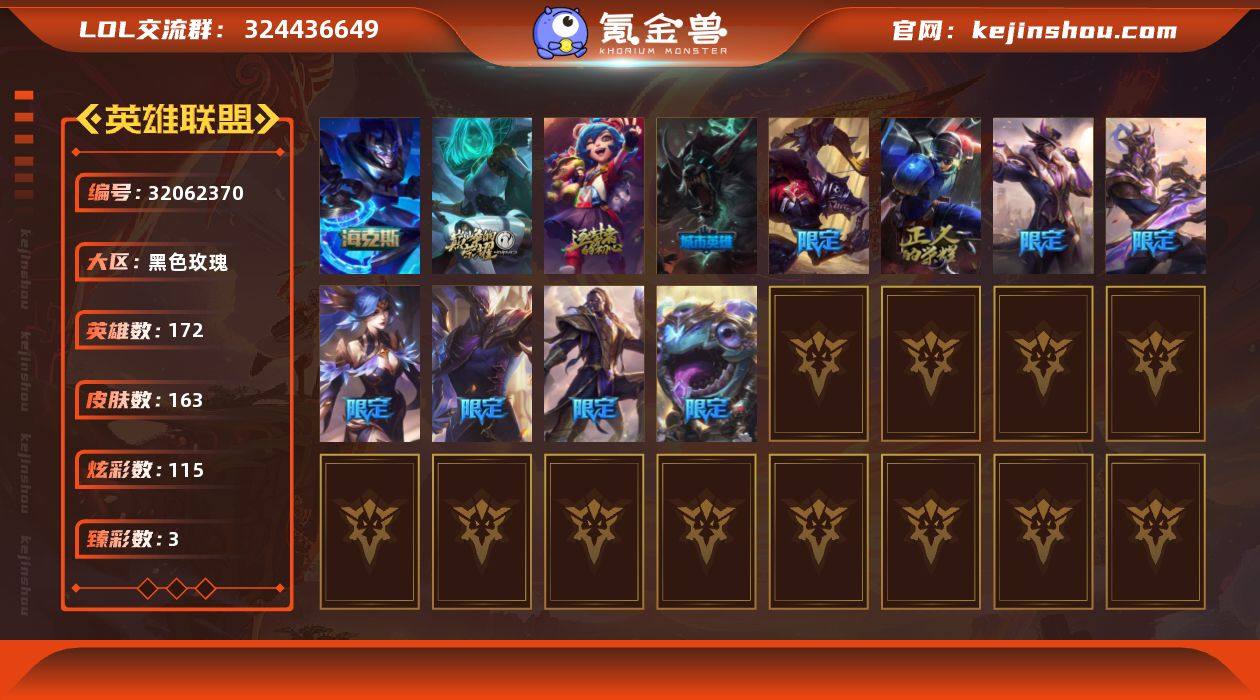 未定级段位-172英雄-163皮肤-115炫彩-0终极-4神话-14限定-16传说-55史诗 【神话皮肤】:十周年纪念安妮,源代码乐芙兰,神凰行者瑞羽圣凰艾尼维亚,海克斯科技嘉文四世 【臻彩皮肤】:闭月之颜貂蝉炫金莲华,魔女阿卡丽虚荣,幽梦玫瑰伊莉丝浪漫花蕾 【海克斯皮肤】:海克斯科技嘉文四世 【冰雪限定】:冰雪节辛吉德 【限定皮肤】:暗裔英雄盖伦,胜利之剑亚托克斯,胜利枪神卢锡安,胜利巨口克格莫,胜利女神娑娜,胜利剑圣易,胜利之运崔斯特,胜利女神菲奥娜,暗影沃里克,勇者阿狸,都铎王朝图奇,防暴天使凯尔 【传说皮肤】:血石领主弗拉基米尔,驯龙炮手崔丝塔娜,女皇艾希,黯晶凤凰艾尼维亚,最终BOSS维迦,陆地王者4WD布里茨,上古战魂魔腾,源计划泯灭雷克顿,神拳李青,神龙尊者圣龙李青,宇航员诺提勒斯,泳池派对吉格斯,灌篮高手德莱厄斯,黑夜使者亚索,神龙尊者昼日真龙亚索,魔女娜美 【史诗皮肤】:冰霜烈焰安妮,屠龙勇士赵信,摄魂男爵弗拉基米尔,重生之沙费德提克,钢铁之心希维尔,源代码索拉卡,火箭达人崔丝塔娜,狼外婆沃里克,黑帮狂花厄运小姐,少林武僧贾克斯,炼金狂士辛吉德,飞越疯人院萨科,武动巅峰萨科,夜刃艾瑞莉娅,穿着正装的恶魔维迦,北领前线斯维因,抵抗军天使凯特琳,黑曜石守护者墨菲特,暗夜猫女卡特琳娜,源计划雄心卡特琳娜,符文战神雷克顿,凯旋英雄嘉文四世,至高之拳李青,地下拳王李青,屠龙勇士薇恩,法老王朝内瑟斯,军神战甲波比,刺客信条凯南,铁甲雄心盖伦,源计划山蕾欧娜,刺客信条锐雯,兔女郎锐雯,深海怪鱼克格莫,奥术光辉拉克丝,星际迷航拉克丝,黑帮教父格雷福斯,暗星韦鲁斯,奥术大师吉格斯,驯龙女巫璐璐,铁血帝皇德莱厄斯,生化骑士德莱厄斯,血羽凤凰奎因,野火之藤婕拉,邪恶魔人扎克,西部牛仔亚索,源计划风亚索,苍穹之光维克兹...