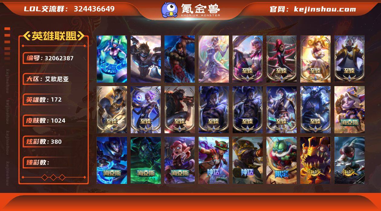 实名: 不可修改 英雄数: 172 皮肤数: 1024 炫彩数: 380 至臻: 至臻 星之守护者 妮寇,至臻 飞升战神 潘森,至臻 真实伤害 亚索,至臻 月蚀骑士 赛娜,至臻 西部魔影 泰隆,至臻 至高天 奎桑提,至臻 墨之影武者 亚索,至臻 心之钢 永恩,至臻 DRX 亚托克斯,至臻 黑色玫瑰假面舞会 卡特琳娜,至臻 战斗学院 奇亚娜 海克斯: 海克斯 嘉文四世,摄魂 薇恩,海克斯 安妮,海克斯 崔丝塔娜 限定: 庆典女皇 艾尼维亚 情人节限定: 觅心萝莉 金克丝,觅心魔灵 奥利安娜,觅心女王 艾希,甜心宝贝 安妮,甜心之羽 霞,幽梦玫瑰 泰隆,水晶玫瑰 迦娜,黯然心伤 阿木木 赛季限定皮: 胜利女神 希维尔,胜利之树 茂凯,胜利枪神 格雷福斯,胜利女神 奥莉安娜,胜利之剑 亚托克斯,胜利枪神 卢锡安,胜利女神 瑟庄妮,胜利凤凰 艾尼维亚,胜利之王 泰达米尔,胜利巨口 克格莫,胜利女神 娑娜,胜利剑圣 易 冠军限定系列: S1FNC 酒桶,S1FNC 迦娜,S1FNC 嘉文四世,S1FNC 卡尔萨斯,S1FNC 库奇,S2 暗杀星 发条,S2 暗杀星 蒙多,S2 暗杀星 努努,S2 暗杀星 慎,S2 暗杀星 伊泽瑞尔,S3 SKT T1 劫,S3 SKT T1 贾克斯,S3 SKT T1 薇恩,S3 SKT T1 李青,S3 SKT T1 婕拉,S4 SSW 锤石,S4 SSW 雷恩加尔,S4 SSW 泰隆,S4 SSW 图奇,S4 SSW 炼金,S5 SKT T1 雷克顿,S5 SKT T1 阿利斯塔,S5 SKT T1 阿兹尔,S5 SKT T1 蜘蛛,S6 SKT T1 烬,S6 SKT T1 球女,S8 IG 卡莎,S10 DWG 蕾欧娜,S5 SKT T1 滑板鞋,S11 EDG 厄斐琉斯,S12 DRX 阿卡丽,S12 DRX 凯特琳 冰雪节限定: 阿木木:“主人不要我了”,冰雪节 格雷福斯,冰雪节 玛尔扎哈,冰雪节 辛吉德,冰雪兽 纳尔,冬季仙境 发条,冬季仙境 卡尔玛,寒冬精灵 璐璐,胡桃夹子 萨科,平安夜女神 娑娜,魄罗骑士 瑟庄妮,圣诞捣蛋鬼 金克丝,圣诞开心鬼 提莫,圣诞精灵 崔丝塔娜,圣诞狂欢 基兰,圣诞狂欢 努努和威朗普,圣诞老人 布隆,圣诞老人 古拉加斯,圣诞糖果棒 厄...