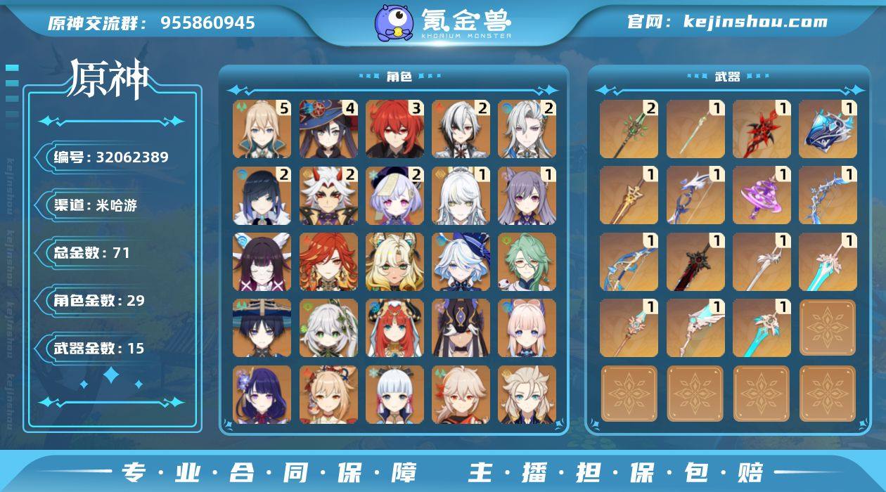 邮箱: 不送邮/死邮 总黄数: 71 冒险等级: 60 5命金色角色: 五命琴 4命金色角色: 四命莫娜 3命金色角色: 三命迪卢克 2命金色角色: 二命七七,二命荒泷一斗,二命夜兰,二命那维莱特,二命阿蕾奇诺 1命金色角色: 一命刻晴,一命兹白 0命金色角色: 枫原万叶,神里绫华,宵宫,达达利亚,钟离,阿贝多,雷电将军,珊瑚宫心海,提纳里,赛诺,妮露,纳西妲,流浪者,迪希雅,白术,芙宁娜,希诺宁,玛薇卡,哥伦比娅 拥有武器: 狼的末路,天空之翼,和璞鸢,天空之傲,风鹰剑,天空之刃,天空之脊,终末嗟叹之诗,冬极白星,神乐之真意,若水,圣显之钥,万世流涌大典,赤月之形,朏魄含光 2精武器: 和璞鸢 1精武器: 狼的末路,天空之翼,天空之傲,风鹰剑,天空之刃,天空之脊,终末嗟叹之诗,冬极白星,神乐之真意,若水,圣显之钥,万世流涌大典,赤月之形,朏魄含光 亮点: Y1-YH9099白术,迪希雅,流浪者,纳西妲,妮露,赛诺,提纳里,钟离,雷电将军,枫原万叶,达达利亚,神里绫华,宵宫,珊瑚宫心海,阿贝多,芙宁娜,希诺宁,玛薇卡,哥伦比娅,刻晴,兹白,七七,荒泷一斗,夜兰,那维莱特,阿蕾奇诺,迪卢