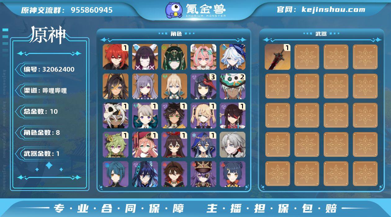 冒险等级:55 总黄数:10 5星角色数:8 5星武器数:1 原石数量:71 相遇之缘数量:0 纠缠之源数量:0 1命迪卢克,0命哥伦比娅,0命奈芙尔,0命瓦雷莎,0命芙宁娜,0命迪希雅,0命刻晴,0命琴 3命九条裟罗,2命伊法,1命琳妮特,1命赛索斯,1命伊安珊,1命安柏,1命北斗,1命菲谢尔,1命柯莱,1命莱依拉,1命烟绯,0命叶洛亚,0命爱诺,0命嘉明,0命卡齐娜,0命欧洛伦,0命香菱,0命行秋,0命夏沃蕾,0命芭芭拉,0命重云,0命多莉,0命凯亚,0命卡维,0命雷泽,0命丽莎,0命米卡,0命诺艾尔,0命砂糖,0命托马,0命早柚 精1狼的末路 100%侦察骑士,古恩希尔德的传承 卖家说:这里还有鸣潮的号,这个价真不亏 联觉等级:78 总黄数:22 五星角色数:11 五星武器数:8 2鸣卡卡罗,1鸣弗洛洛,0鸣爱弥斯,0鸣尤诺,0鸣卡提希娅,0鸣赞妮,0鸣椿,0鸣长离,0鸣忌炎,0鸣安可,0鸣维里奈 6鸣渊武,6鸣莫特斐,6鸣丹瑾,6鸣秋水,6鸣白芷,4鸣炽霞,3鸣散华,3鸣秧秧,2鸣釉瑚,2鸣桃祈,1鸣灯灯 1鸣万物持存的注释,1鸣焰光裁定,1鸣苍鳞千嶂,1鸣血誓盟约,1鸣浩境粼光,1鸣千古洑流,1鸣漪澜浮录