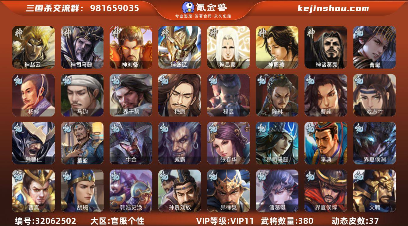 官阶:大将军;VIP等级:VIP11;史诗武将数量:42;动态皮肤数量:37;武将总数:380;史诗宝珠数量:0;将魂数量:13729;神将:5;魏国史诗武将:30;蜀国史诗武将:9;吴国史诗武将:4;群史诗武将:17 神赵云,神司马懿,神刘备,神张辽,神诸葛亮,曹髦,杨修,马钧,界于禁,嵇康,陈琳,曹纯,戏志才,程昱,关索,马云騄,诸葛瞻,赵襄,张星彩,王平,沙摩柯,界黄忠,董允,吴景,孙寒华,界徐盛,贺齐,界沮授,左慈,张让,陶谦,审配,麹义,祢衡,沮授,界左慈,杜预,谋张角,许攸,星董卓,兀突骨,士燮,司马昭,神吕蒙,神周瑜,SP关羽,SP曹仁,SP蔡文姬,乐进,曹昂,诸葛诞,朱灵,文聘,SP姜维,张春华,钟会,曹冲,郭淮,满宠,界王异,界曹操,界司马懿,界夏侯惇,界张辽,界许褚,界郭嘉,李典,曹真,韩浩史涣,陈群,曹叡,曹休,钟繇,司马朗,王基,李通,郭皇后,孙资刘放,辛宪英,界甄姬,吕虔,鲁芝,蒯越蒯良,界典韦,界荀彧,界徐晃,杜畿,界曹丕,毌丘俭,界邓艾,张恭,贾逵,界曹植,界曹彰,界满宠,界郭淮,卞夫人,袁涣,崔琰,阮慧,谋徐晃,谋于禁,界曹休,胡班,牛金,界夏侯渊,界曹仁,臧霸,唐咨,董昭,SP孙尚香,关银屏,夏侯霸,马良,关兴张苞,廖化,界马岱,关平,简雍,刘封,界法正,界关兴张苞,界刘备,界关羽,界张飞,界赵云,界马超,SP徐庶,吴懿,周仓,张松,刘谌,夏侯氏,糜竺,马忠,孙乾,李严,黄皓,吴苋,秦宓,界黄月英,界诸葛亮,赵统赵广,严颜,界伊籍,界卧龙诸葛,界庞统,界孟获,界祝融,陈到,界姜维,界刘禅,吕凯,张翼,杨仪,邓芝,陈震,费祎,糜夫人,向宠,宗预,蒋琬,彭羕,谋庞统,谋姜维,谋张飞,诸葛果,界魏延,蒋琬费祎,糜芳傅士仁,甘夫人,鲁肃,孙茹,凌操,大乔小乔,诸葛恪,诸葛瑾,孙鲁育,程普,韩当,潘璋马忠,虞翻,朱然,界周泰,界甘宁,界吕蒙,界黄盖,界周瑜,界大乔,界陆逊,孙鲁班,朱桓,顾雍,孙休,朱治,全琮,步骘,阚泽,孙登,岑昏,徐氏,薛综,界孙权,界孙尚香,潘濬,SP庞统,陆绩,孙亮,严畯,界孙坚,吕岱,周...