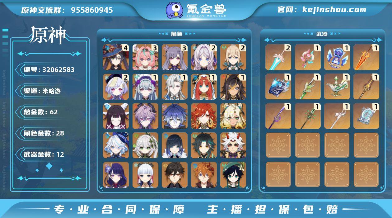 邮箱: 未绑定 总黄数: 62 冒险等级: 60 4命金色角色: 四命莫娜 3命金色角色: 三命刻晴,三命瓦雷莎 2命金色角色: 二命七七,二命琴,二命茜特菈莉 1命金色角色: 一命妮露,一命迪希雅,一命那维莱特,一命梦见月瑞希 0命金色角色: 迪卢克,温迪,神里绫华,达达利亚,钟离,魈,雷电将军,荒泷一斗,神里绫人,夜兰,提纳里,纳西妲,芙宁娜,希诺宁,玛薇卡,菲林斯,杜林,哥伦比娅 拥有武器: 四风原典,和璞鸢,天空之傲,风鹰剑,薙草之稻光,赤沙之杖,千夜浮梦,裁叶萃光,万世流涌大典,焚曜千阳,祭星者之望,溢彩心念 2精武器: 天空之傲 1精武器: 四风原典,和璞鸢,风鹰剑,薙草之稻光,赤沙之杖,千夜浮梦,裁叶萃光,万世流涌大典,焚曜千阳,祭星者之望,溢彩心念 亮点: Y1-YH9093纳西妲,提纳里,钟离,温迪,雷电将军,魈,达达利亚,神里绫华,迪卢克,荒泷一斗,神里凌人,夜兰,芙宁娜,希诺宁,玛薇卡,菲林斯,杜林,哥伦比娅,迪希雅,妮露,那维莱特,梦见月瑞希,七七,琴,茜特菈莉,刻晴,瓦雷莎,莫娜,班尼特,北斗,香菱,芭芭拉,迪奥娜,行秋,菲谢尔,瑶瑶,鹿野院平藏,凝光,云堇,