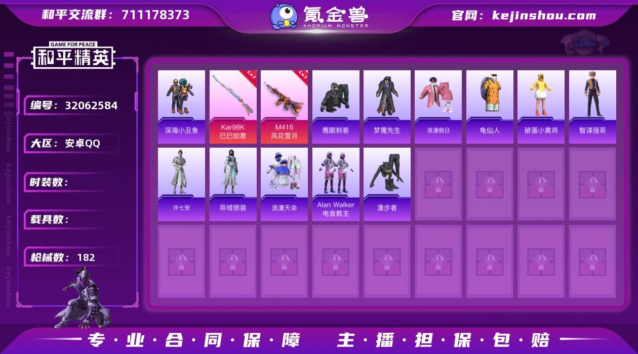 DSH2289【身法号3特风花雪月 2粉深海小丑鱼,暗影哥特,浪漫天命】安卓手Q-2粉装-3特效枪-154套装-182枪皮-12王牌印记-坚韧铂金Ⅴ-50333热力值【2粉装】角色-星渊,角色-异瞳寒姬【3特效枪】Kar98K-巳巳如意[5级],M416-风花雪月[5级],DP-28-豹影疾电[5级]【5稀有】深海小丑鱼,浪漫天命,暗影哥特,M762-奇异狩猎者,汤姆逊-奇异狩猎者【9飞行器】空岛之星尾迹,狂鲨锋刃飞行器,粉色滑翔尾迹,马上有福飞行器,鸡智如我飞行器,异域银装飞行器,光之冒险尾迹,炫彩糖果飞行器,登顶巅峰飞行器【326其它衣服和枪皮】巳巳如意,异域银装,白色伏地魔,竞技达人朋克,极速红龙,空投萌叽,绮丽涂鸦,福星高照,缤纷果语,海岛探路者,青年教官,橘黑制服,战术大师,长空猛禽,虎虎生威吉莉,完美偶像,萌趣咩咩,元素星魂,绚烂繁星,元气之梦,游乐,红色运动,幻世保卫者,滨海假日,SS24特训,龙的传人,画境星梦,蓝彩潮人,风迹短诗,秘语星愿,龟仙人,SS25特训,滨海厨神,黑色伏地魔,SS22特训,蓝色运动,六六大吉,红潮炫舞,街头风暴,冷焰舞者,智谋强哥,SS34特训,老实芭蕉,酒红色名流,猎鹰,都市魅力,魅力单车,人气偶像,萌鸡速递,光之冒险,牛气冲天,星途旅人,热血青春,极地朋克,深蓝色名流,空岛之星,云魄琉璃,幻世战舞者,SS35特训,SS19特训,SS36特训,SS27特训,鹰眼刺客,蝶变,黄色运动,夏日倾情,SS29特训,SS23特训,虚音幻奏,玉兔迎春,和煦暖阳,娇憨猪猪,白熊同盟,青玉碎影,SS30特训,Alan Walker,萌黄之夏,探宝勇士,怒火燎原,牛气满满,SS18特训,竞技名士,暗金炫舞,漫步者,沙漠兵团,角色-绯色魅影,鹤鸣,甜心亚梦,炫蓝之夏,青涩时光,SS20特训,湖蓝色名流,海盐绵绵冰,坚韧舞者,琴音绮想,炫彩糖果,薄荷星砂,燃烧卡路里,飞驰魅影,猎梦纪元,涂山之恋,青翼流星,王牌教练,幻影武者,夏日音浪,轻风白浪,田园牧歌,浪漫假日,破晓战魂,大橘大利,黄色名流,SS32特训,雪国风尚,柠...