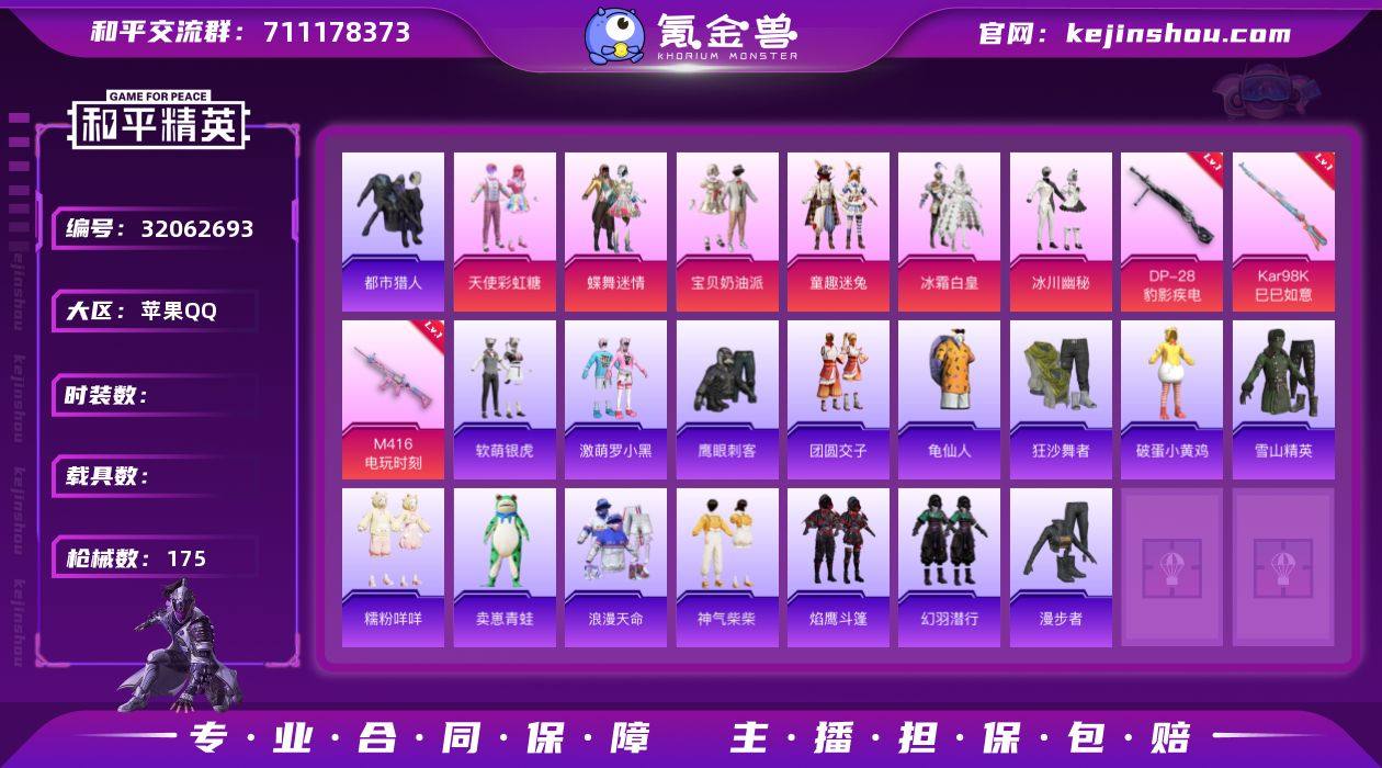 XS11400【女号身法号6粉装-3特效枪 梦幻火箭 都市猎人 浪漫天命 激萌罗小黑 童趣迷兔,蝶舞迷情 天使彩虹糖,冰川幽秘,宝贝奶油派】苹果手Q-6粉装-3特效枪-150套装-175枪皮-11王牌印记-超级王牌-54265热力值【6粉装】童趣迷兔,蝶舞迷情,冰霜白皇,天使彩虹糖,冰川幽秘,宝贝奶油派【3特效枪】DP-28-豹影疾电[5级],M416-电玩时刻[5级],Kar98K-巳巳如意[5级]【4稀有】狂沙舞者,浪漫天命,激萌罗小黑,都市猎人【9飞行器】春暖花开飞行器,狂鲨锋刃飞行器,光之冒险尾迹,马上有福飞行器,绒雪飘舞飞行器,异域银装飞行器,鸡智如我飞行器,炫彩糖果飞行器,红色滑翔尾迹【3头盔】甜心宝贝头盔,幻影战神头盔,童趣迷兔头盔【1背包】甜心宝贝背包【312其它衣服和枪皮】糯粉咩咩,滨海厨神,萌趣咩咩,战地督导,幻世战舞者,虚音幻奏,和煦暖阳,竞技勇士朋克,荣耀,SS15特训,青春冒险家,角色-夜瞳黯灵,惊鸿侠骨,空岛之星,极速红龙,冰冻风暴,野性战心,暖心熊熊,快闪甜心,萌趣颜团子,SS22特训,恋语绒绒,SS28特训,田园牧歌,角色-银尘,SS36特训,冷焰舞者,音速流光,轻风白浪,SS18特训,鹰眼刺客,玉兔迎春,智慧之神,破晓战魂,潮流游乐家,SS16特训,薄荷星砂,都市魅力,牛气满满,破蛋小黄鸡,龟仙人,灼焰舞者,蓝色守护者,SS9特训,北国孤狼,甜心亚梦,人气偶像,SS25特训,妙红点点,SS33特训,鹤鸣,SS13特训,幻羽潜行,SS8特训,萝兰蝴蝶,街头潮人,滨海假日,黄色名流,SS35特训,软萌银虎,蓝彩潮人,幻彩翩翩,魅力单车,海盐绵绵冰,SS27特训,漫步者,超能拳王,竞技名士,云魄琉璃,雪国风尚,SS31特训,吉莉礼服,春光漫游,耀粉歌者,海岛探路者,柠萌假日,酷潮明星,探宝勇士,燕燕于飞,SS20特训,微雨春柳,夏日音浪,纯真浪花,SS29特训,游乐,蝶变,湖蓝色名流,淡雅花蕊,琉璃情波,萌黄之夏,霓虹街区,懵萌河马,粉黛兰香,特训学院,热情海星,SS32特训,SS26特训,炫彩糖果,白糯汤圆,...