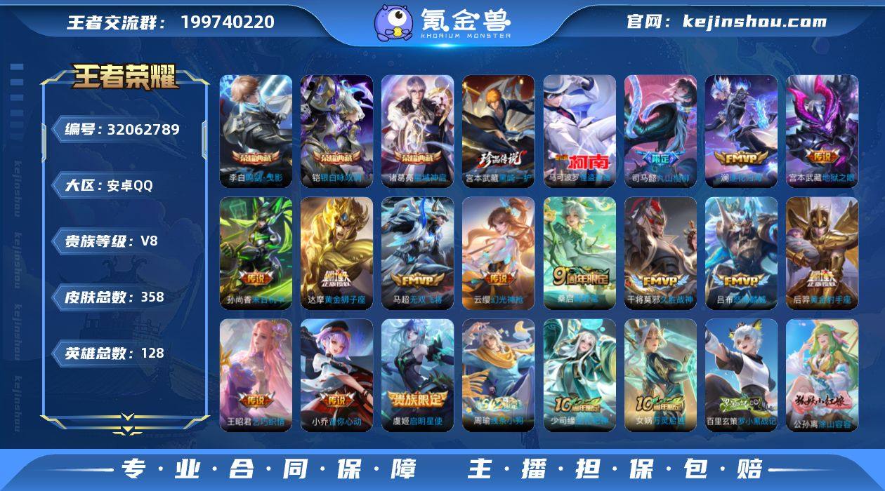 实名: 可修改 性别: 男号 贵族等级: V8 英雄数: 128 皮肤数: 358 荣耀水晶: 鸣剑·曳影,星域神启,银白咏叹调 珍品传说: 怪盗基德,黑崎一护 传说皮: 黄金狮子座,黄金射手座,久胜战神,末日机甲-孙尚香,音你心动-小乔,地狱之眼,乞巧织情,无双飞将,澜逐花归海,幻光神枪,九山相柳 限定皮: 李小龙,烈魂,至尊宝,高山流水,匿光决锋者,五谷丰年,怒海麟威,山海·玄木吟,鸣野蒿,逐霄战戟 亮点: 【优质装备】:鸣剑·曳影,星域神启(倪克斯贼亮),银白咏叹调(倪克斯侍卫),怪盗基德,黑崎一护,黄金狮子座,黄金射手座,久胜战神,末日机甲-孙尚香(绿蚂蚱),音你心动-小乔,地狱之眼,乞巧织情,无双飞将,澜逐花归海,涂山容容