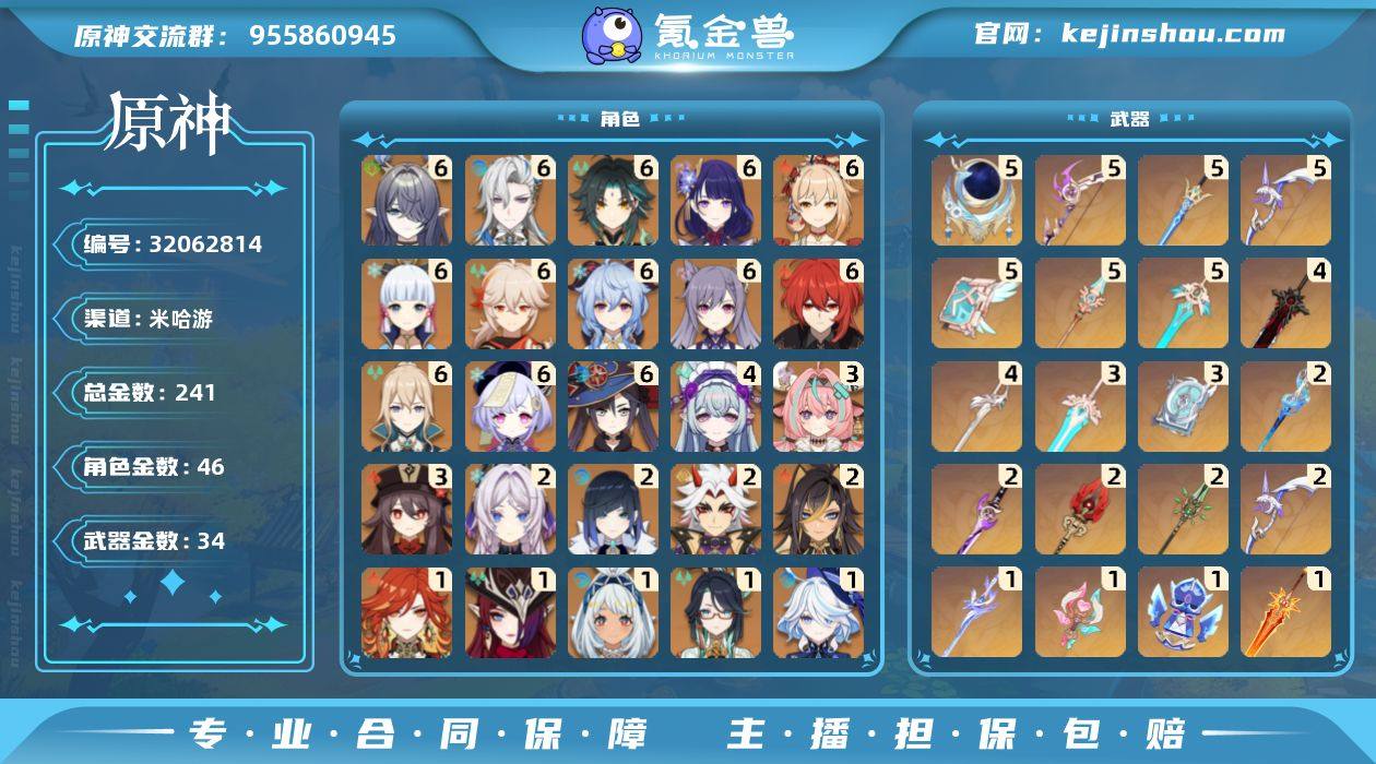 邮箱: 不送邮/死邮 总黄数: 241 冒险等级: 60 6命金色角色: 满命迪卢克,满命枫原万叶,满命神里绫华,满命宵宫,满命七七,满命刻晴,满命莫娜,满命琴,满命甘雨,满命魈,满命雷电将军,满命那维莱特,满命菈乌玛 4命金色角色: 四命梦见月瑞希 3命金色角色: 三命胡桃,三命瓦雷莎 2命金色角色: 二命荒泷一斗,二命夜兰,二命迪希雅,二命茜特菈莉 1命金色角色: 一命申鹤,一命提纳里,一命妮露,一命白术,一命芙宁娜,一命闲云,一命玛拉妮,一命恰斯卡,一命玛薇卡 0命金色角色: 达达利亚,钟离,阿贝多,珊瑚宫心海,八重神子,纳西妲,流浪者,艾尔海森,娜维娅,希格雯,艾梅莉埃,希诺宁,丝柯克,菲林斯,奈芙尔,杜林,哥伦比娅 拥有武器: 狼的末路,雾切之回光,飞雷之弦振,四风原典,天空之卷,和璞鸢,阿莫斯之弓,天空之傲,风鹰剑,天空之刃,无工之剑,天空之脊,磐岩结绿,护摩之杖,薙草之稻光,苍古自由之誓,息灾,赤角石溃杵,若水,圣显之钥,千夜浮梦,图莱杜拉的回忆,裁叶萃光,碧落之珑,万世流涌大典,静水流涌之辉,鹤鸣余音,白雨心弦,星鹫赤羽,焚曜千阳,祭星者之望,溢彩心念,苍耀,纺夜天镜