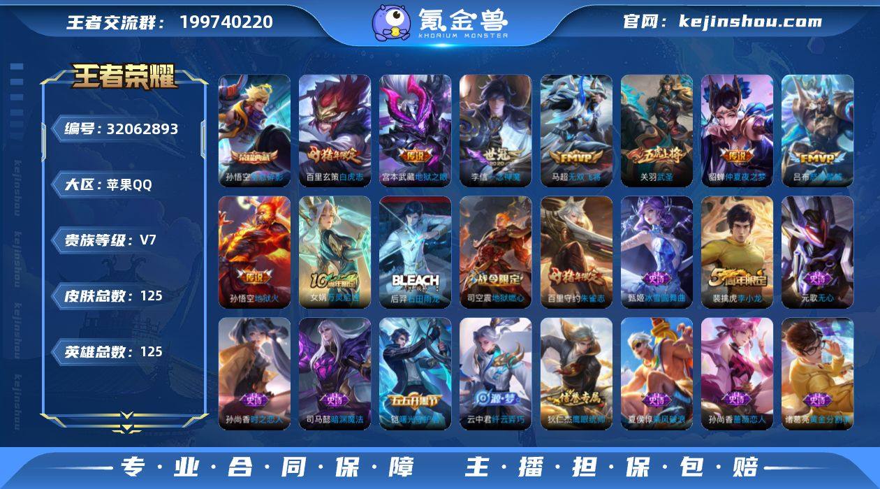 实名: 可修改 性别: 男号 贵族等级: V7 英雄数: 125 皮肤数: 125 荣耀水晶: 全息碎影 传说皮: 一念神魔,地狱火,仲夏夜之梦,地狱之眼,无双飞将 限定皮: 遇见飞天,李小龙,武圣,逐梦之光,美猴王,白虎志,朱雀志,怒海麟威 亮点: 【优质装备】:全息碎影(猴子典藏),一念神魔,地狱火,仲夏夜之梦(大飞蛾),地狱之眼,无双飞将