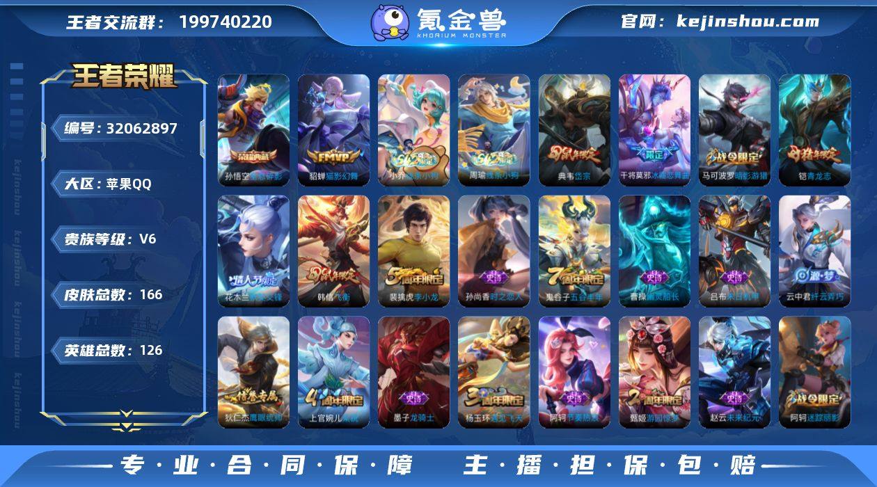 实名: 可修改 性别: 男号 贵族等级: V6 英雄数: 126 皮肤数: 166 荣耀水晶: 全息碎影 传说皮: 猫影幻舞 限定皮: 遇见飞天,李小龙,游园惊梦,梁祝,岱宗,飞衡,冰霜恋舞曲,青龙志,默契交锋-花木兰,五谷丰年 亮点: 【优质装备】:全息碎影(猴子典藏),猫影幻舞