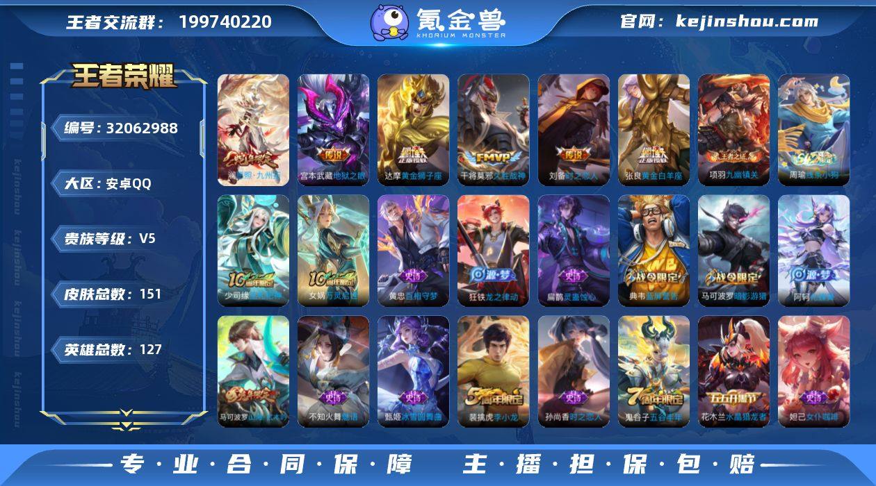 实名: 可修改 性别: 女号 贵族等级: V5 英雄数: 127 皮肤数: 151 传说皮: 黄金狮子座,黄金白羊座,久胜战神,地狱之眼,时之恋人-刘备 限定皮: 李小龙,五谷丰年,山海·玄木吟,愿照·九州拓 亮点: 【优质装备】:黄金狮子座,黄金白羊座,久胜战神,地狱之眼,时之恋人-刘备(电焊工)