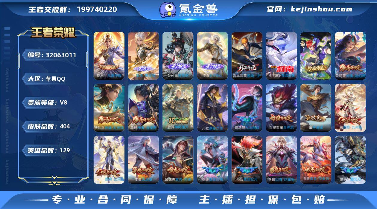 实名: 可修改 性别: 男号 贵族等级: V8 英雄数: 129 皮肤数: 404 荣耀水晶: 九霄神辉 无双皮: 碎月剑心,离恨烟,器灵·螭龙剑 珍品传说: 怪盗基德,时之奇旅-孙策,黑崎一护 传说皮: 黄金狮子座,黄金射手座,黄金白羊座,炽阳神光,地狱之眼,李逍遥,无双飞将,山海·炽霜斩,炽翼辉光,浮生妄,澜逐花归海,琥珀纪元马超,乘龙·问璇玑,乘龙·铭钟鼎,乘龙·淬吴钩,貂蝉曦玄引,落雪白狼,金乌负日,铠冥王哈迪斯,玄雷天君,幻光神枪,九山相柳,诡秘之主,神树通天,神骥·赴朔漠,神骥·鸣幻洲,神骥·逐星野 限定皮: 冰锋战神,遇见飞天,李小龙,游园惊梦,梁祝,时雨天司,白晶晶,神威,冰霜恋舞曲,凤求凰,白虎志,至尊宝,一生所爱,大圣娶亲,默契交锋-花木兰,匿光追影者,寅虎·赤拳,补天,玉兔公主,五谷丰年,绯月行,诗剑行,降魔,怒海麟威,山海·玄木吟,无限倾心-虞姬,夏侯惇霜北刀,鸣野蒿,陌上桑,愿照·山河定,愿照·九州拓 亮点: 【优质装备】:九霄神辉(木兰典藏),碎月剑心(李白无双),离恨烟(公孙离无双),器灵·螭龙剑,怪盗基德,黑崎一护,黄金狮子座,黄金射手座,黄金白羊座,炽阳神光,地狱之眼,李逍遥,无双飞将,山海·炽霜斩(李信年限),炽翼辉光(娃娃菜牛角包),浮生妄,澜逐花归海,琥珀纪元马超,金乌负日,玄雷天君,诡秘之主,涂山容容