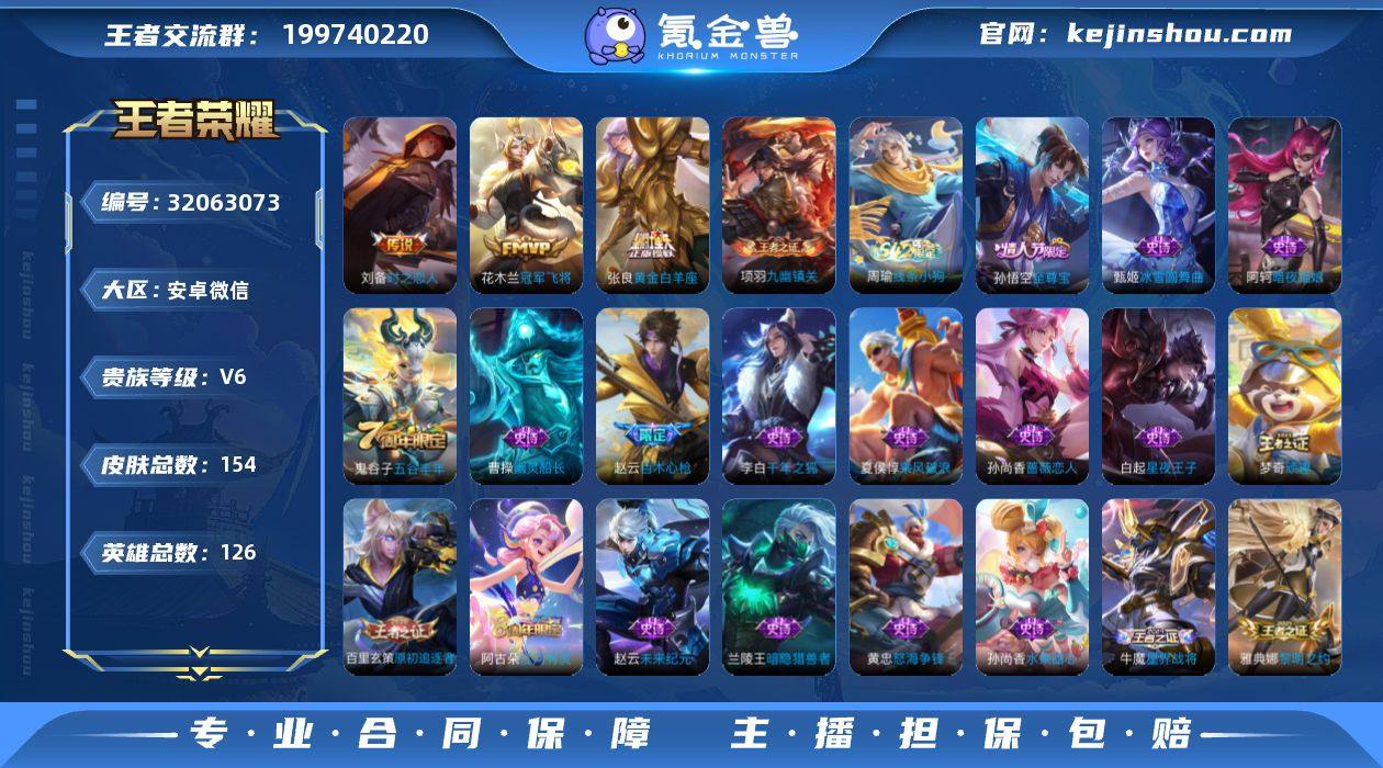 实名: 可修改 性别: 男号 贵族等级: V6 英雄数: 126 皮肤数: 154 传说皮: 冠军飞将,黄金白羊座,时之恋人-刘备 限定皮: 至尊宝,高山流水,百木心枪,五谷丰年 亮点: 【优质装备】:冠军飞将,黄金白羊座,时之恋人-刘备(电焊工)